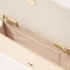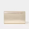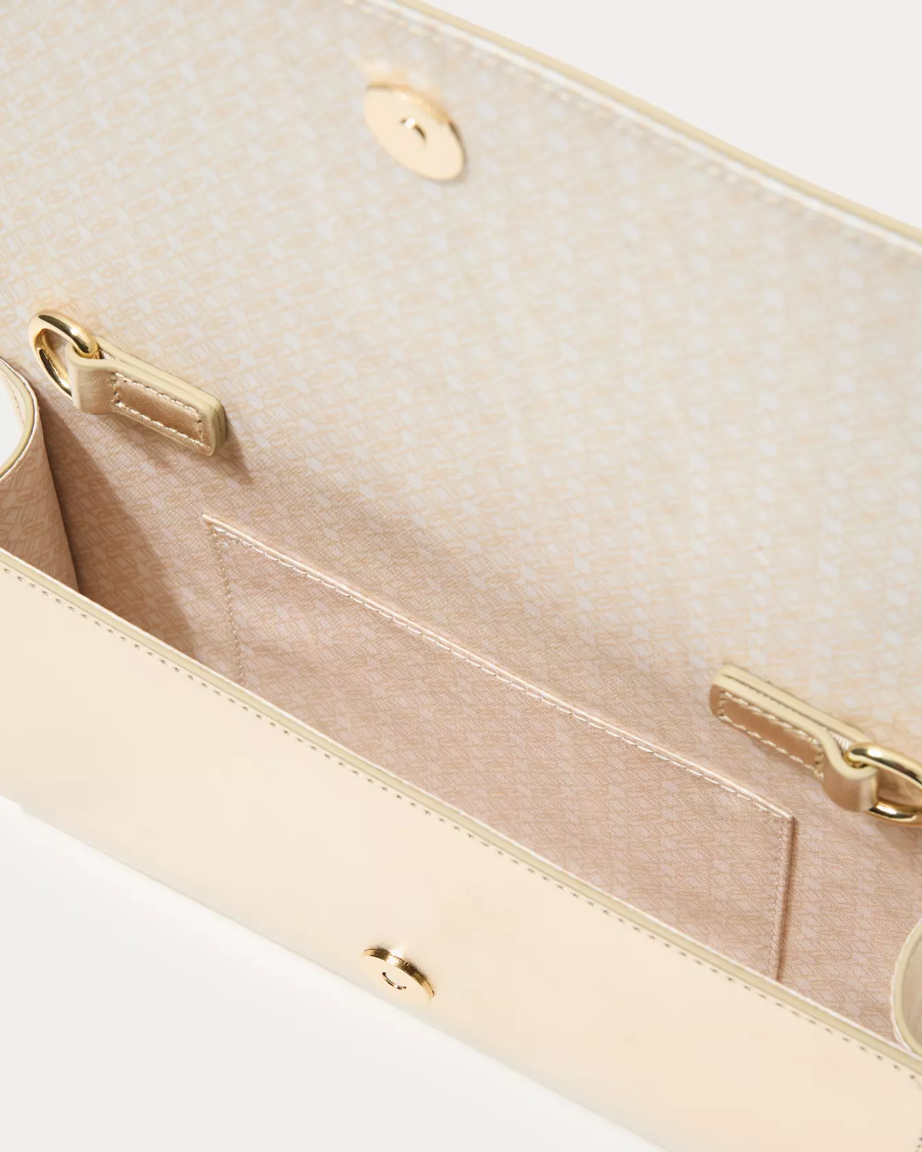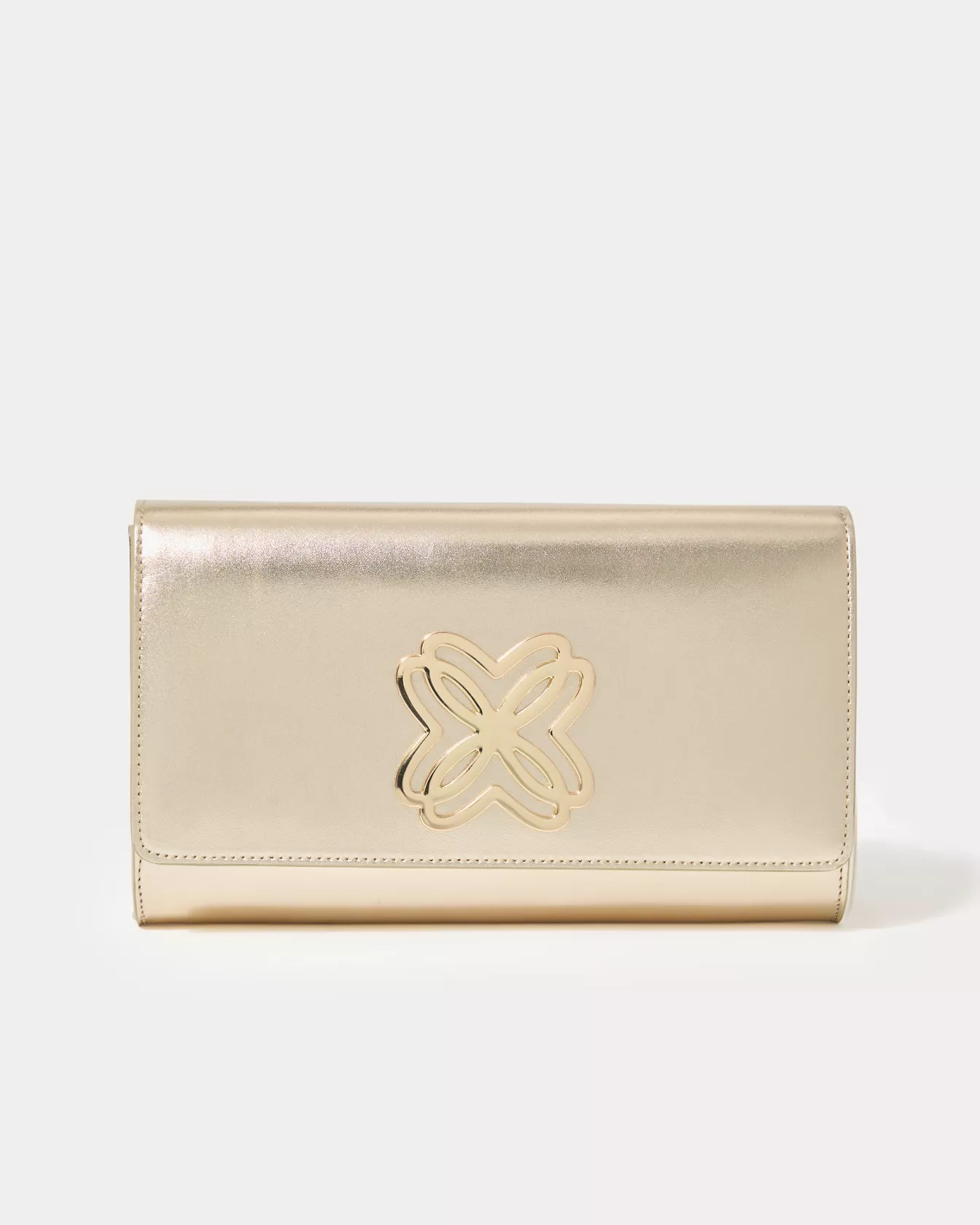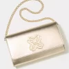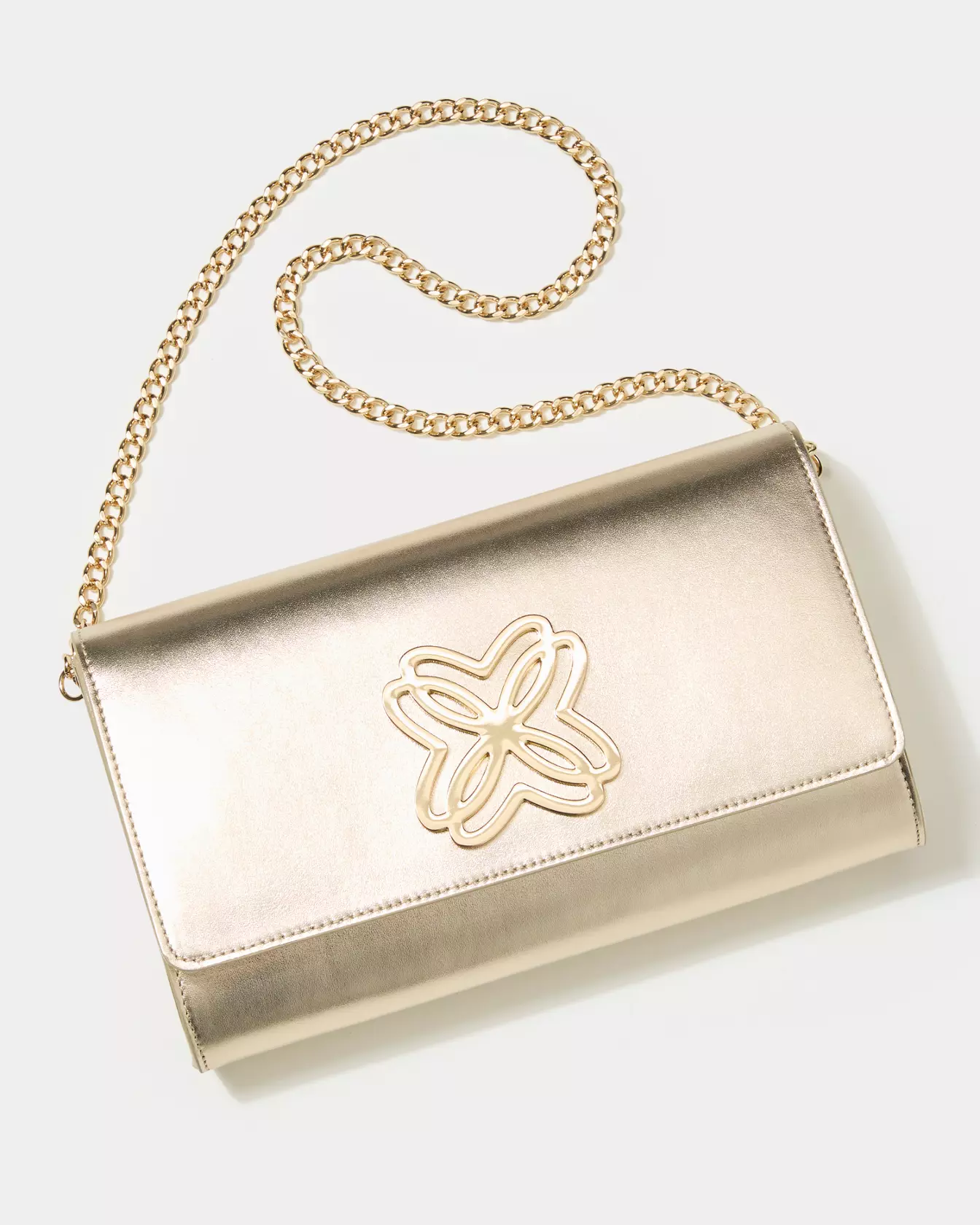 - Gold clutch with Lilly logo hardware, printed lining, and a detachable gold metal chain crossbody strap.