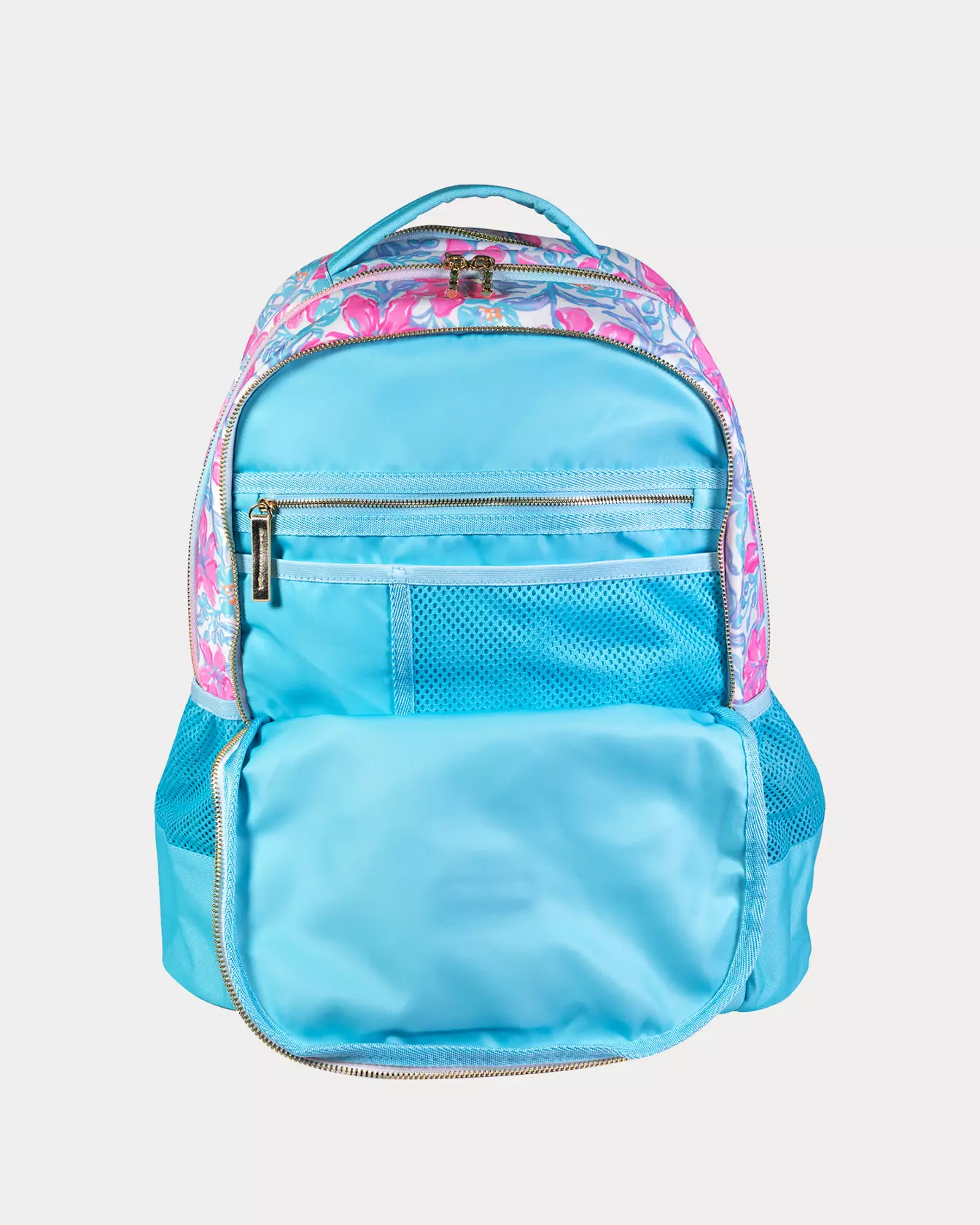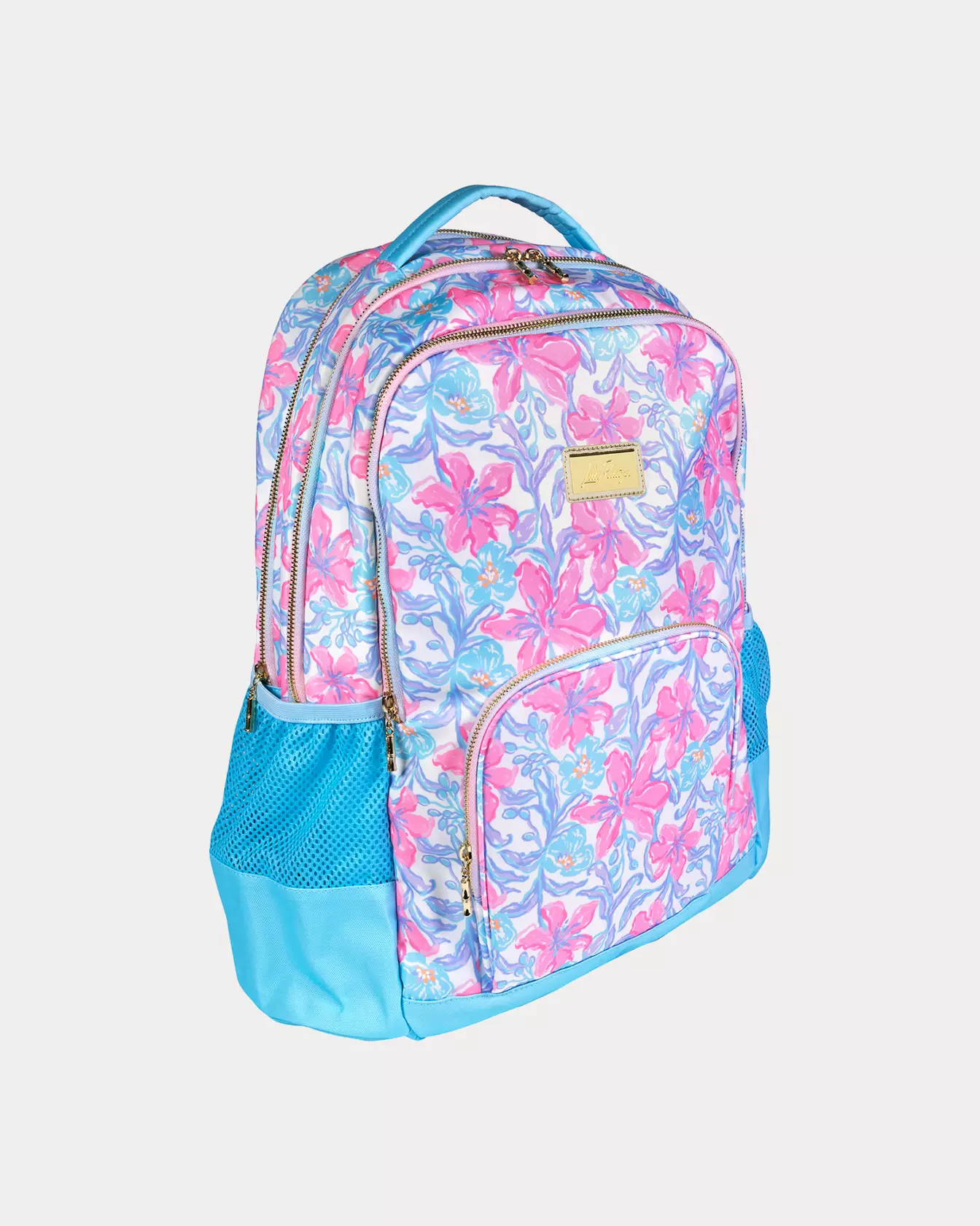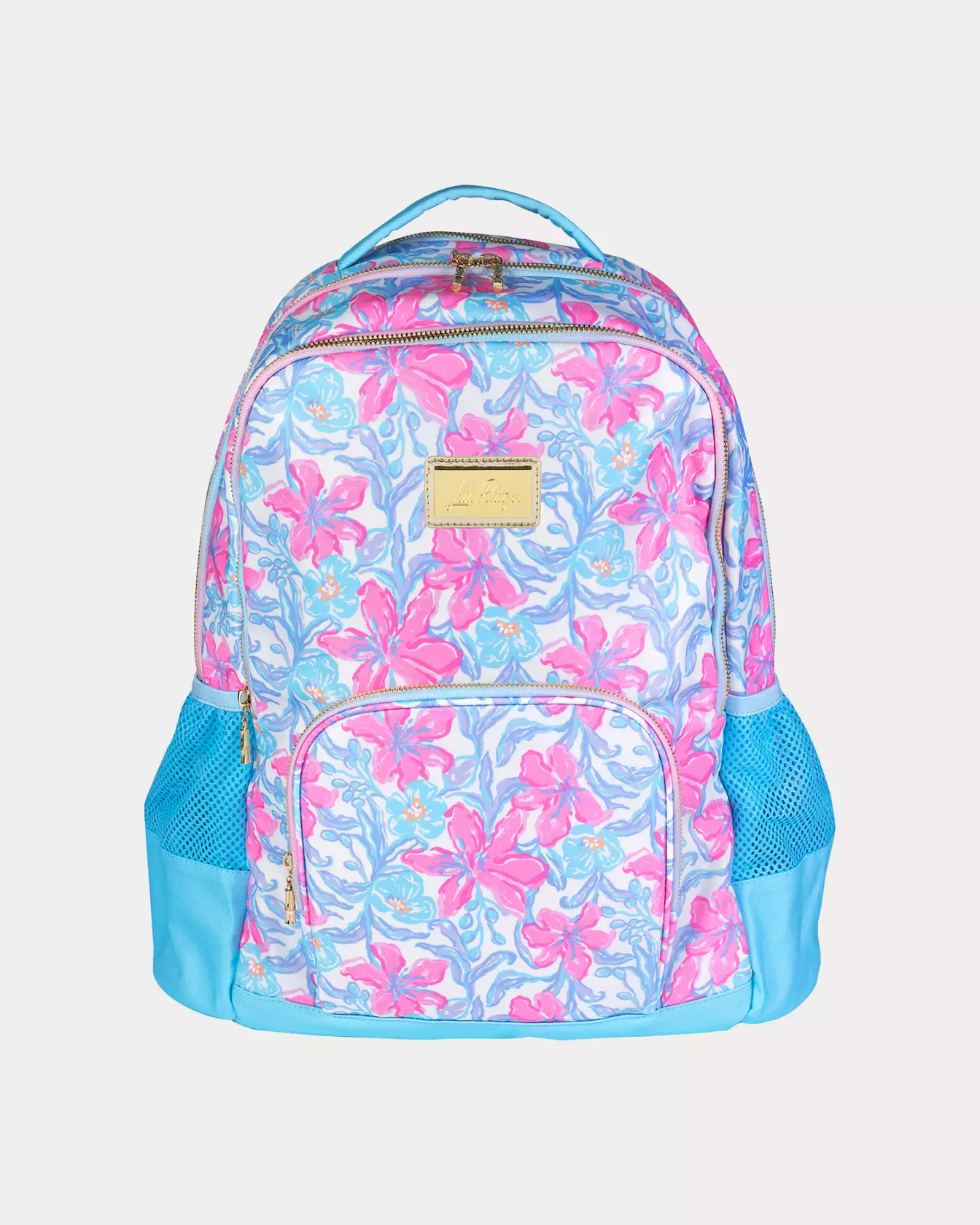 - Backpack with adjustable straps, front zip pocket, side mesh pockets with elastic, gold bamboo zipper pulls, and gold logo plaque.