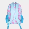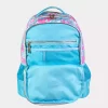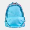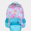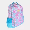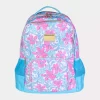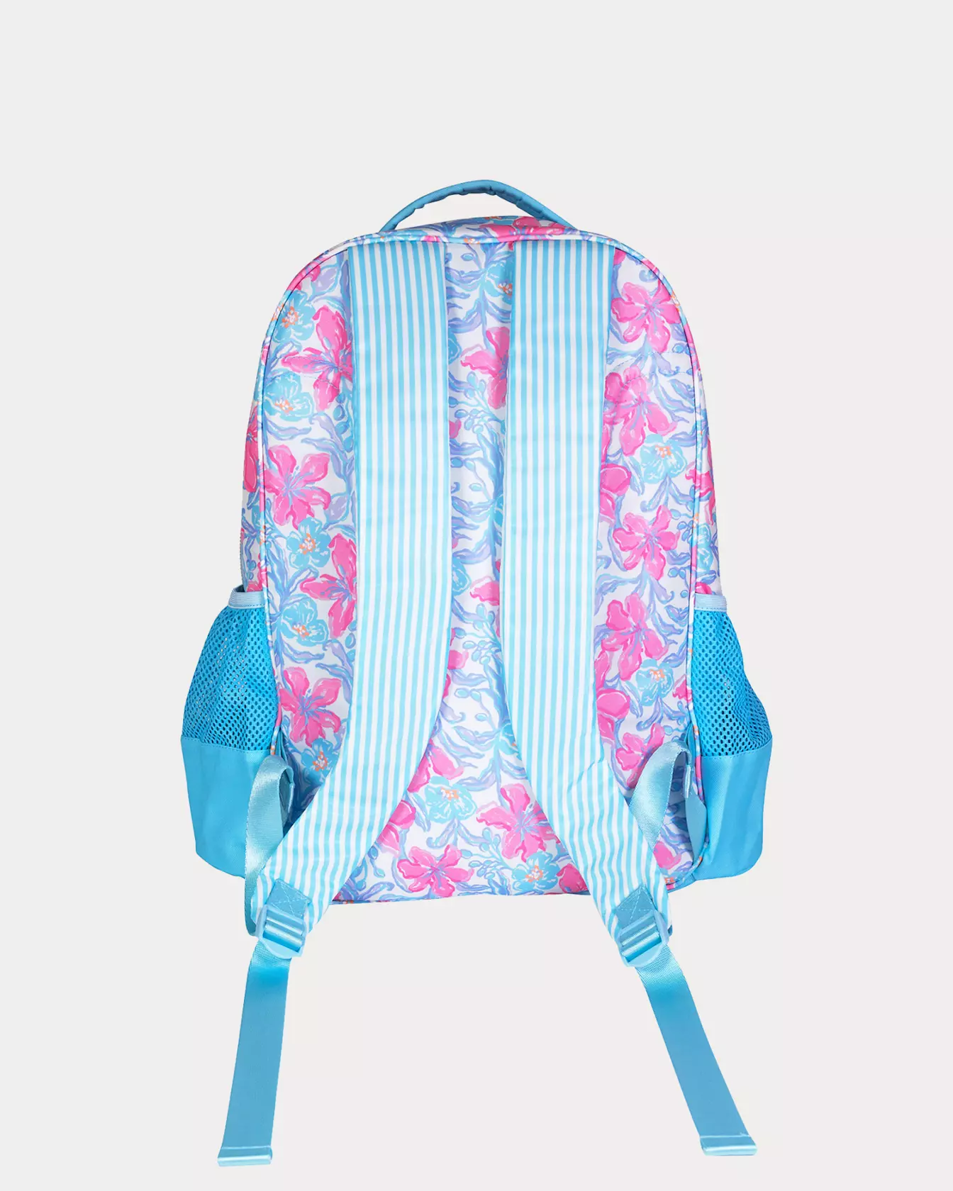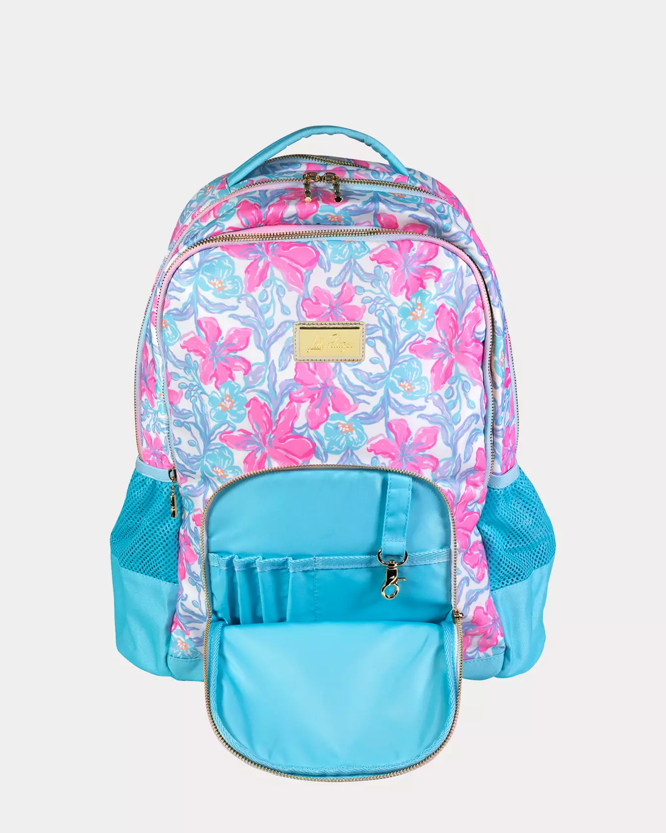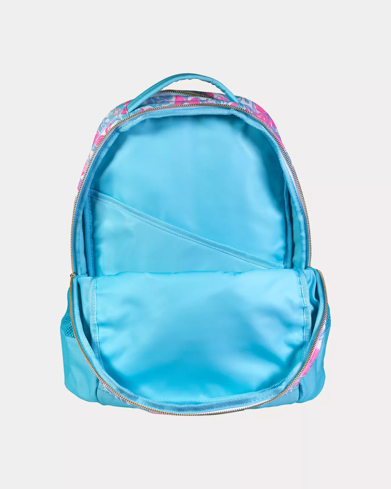 - Backpack with adjustable straps, front zip pocket, side mesh pockets with elastic, gold bamboo zipper pulls, and gold logo plaque.