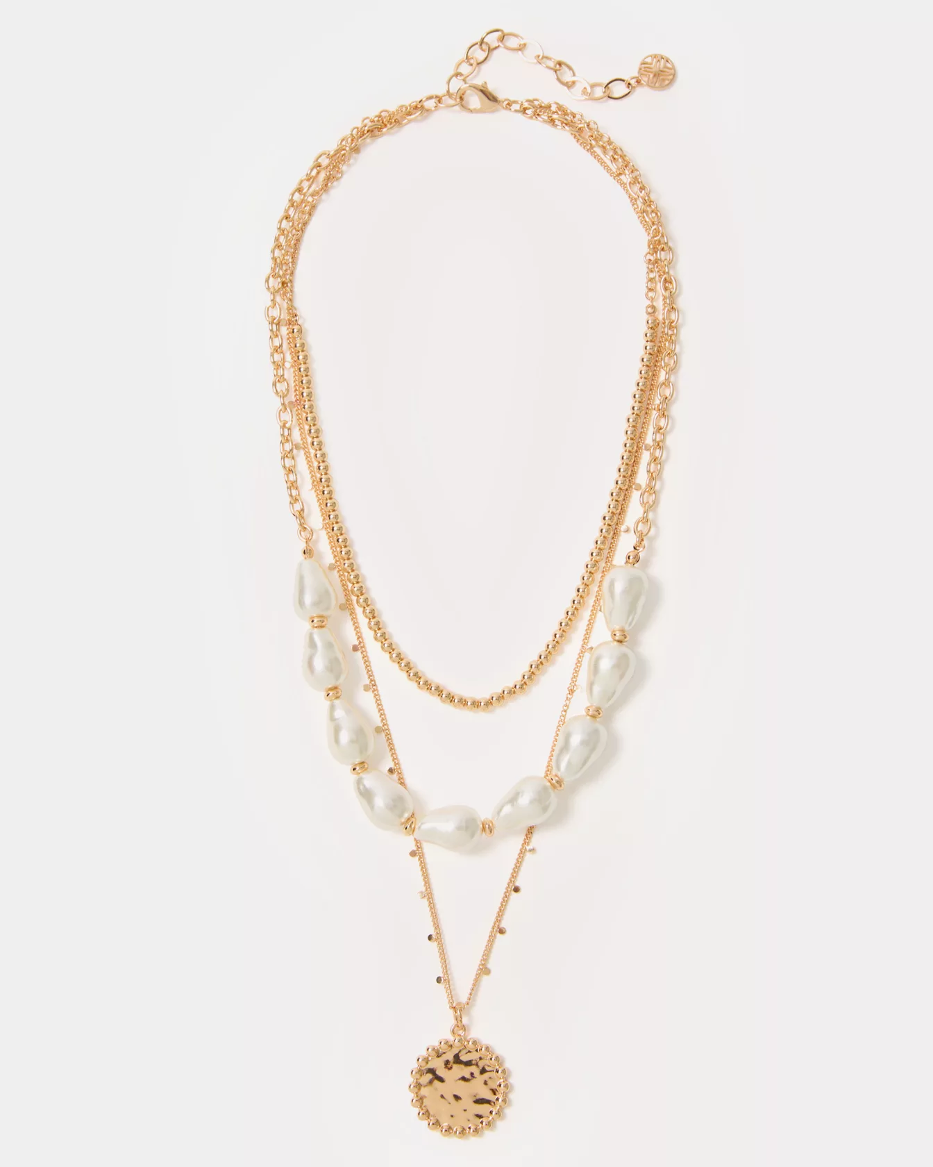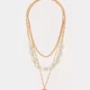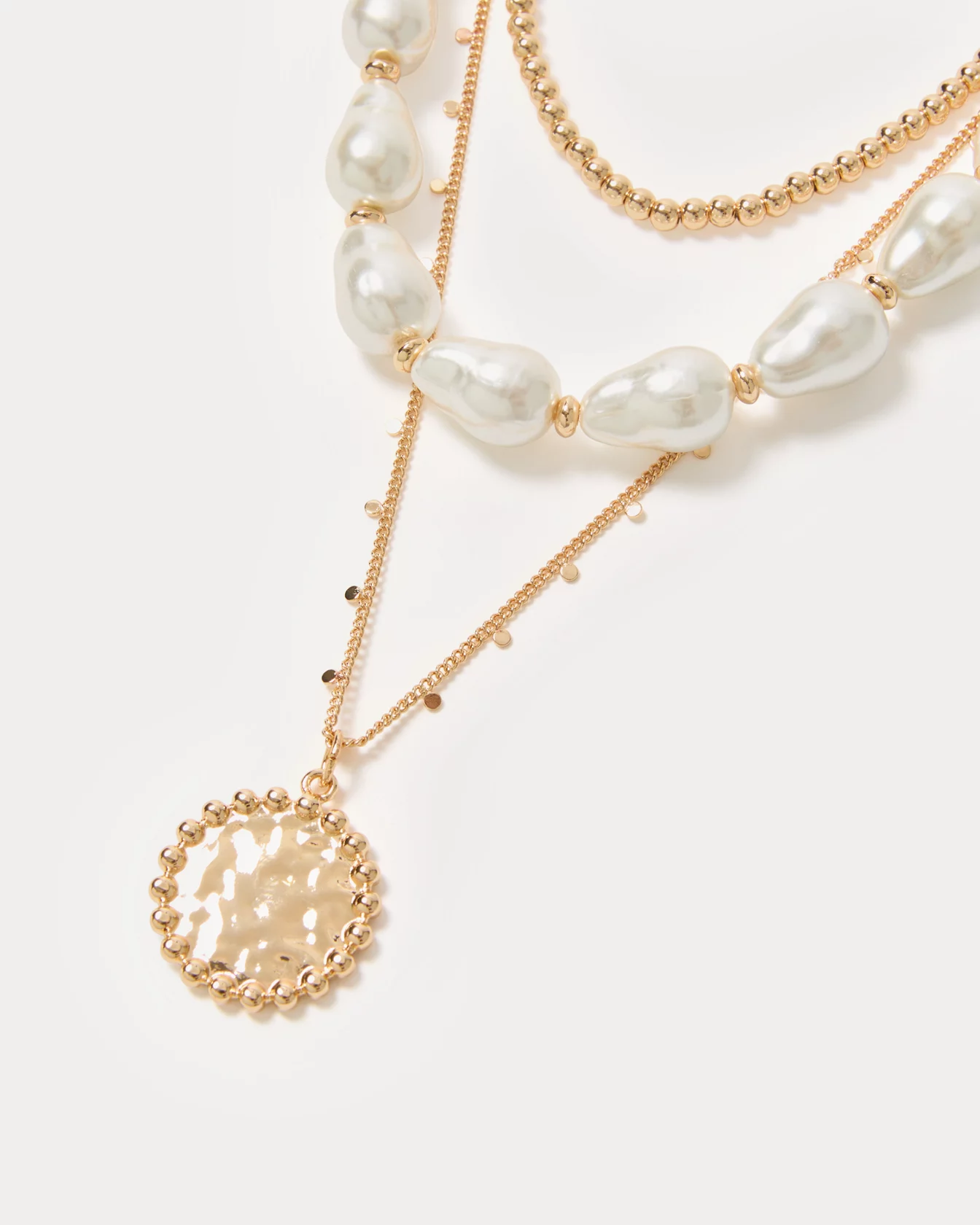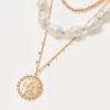 - Triple layer necklace with baroque pearls, gold beads, and a round pendant charm.