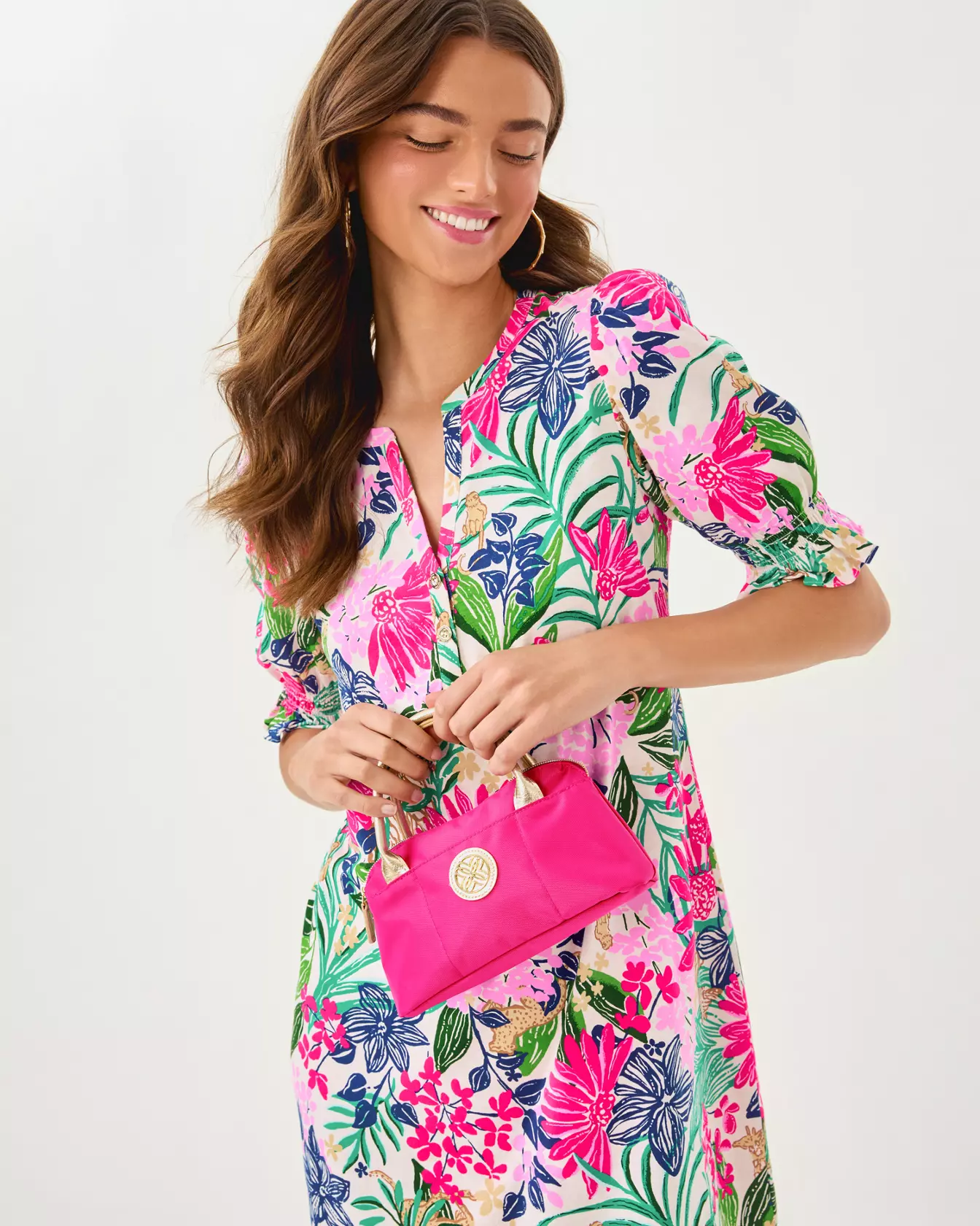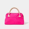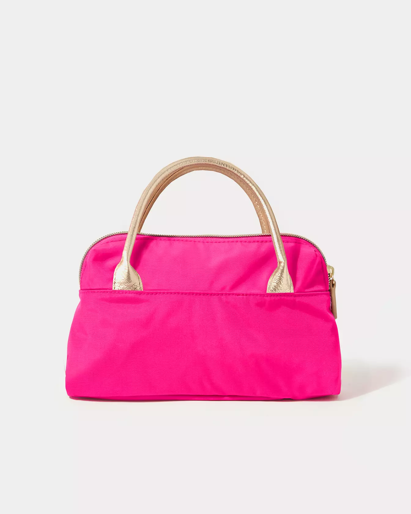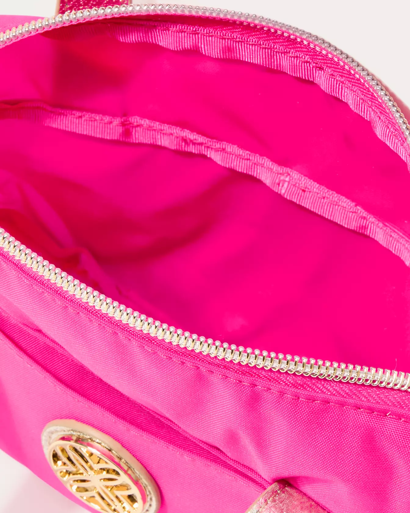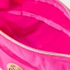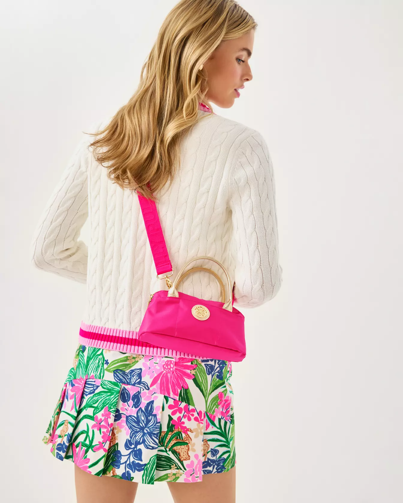 - Nylon top handle mini bag with a front slip pocket, zip top closure, and detachable logo jacquard webbing crossbody strap.