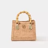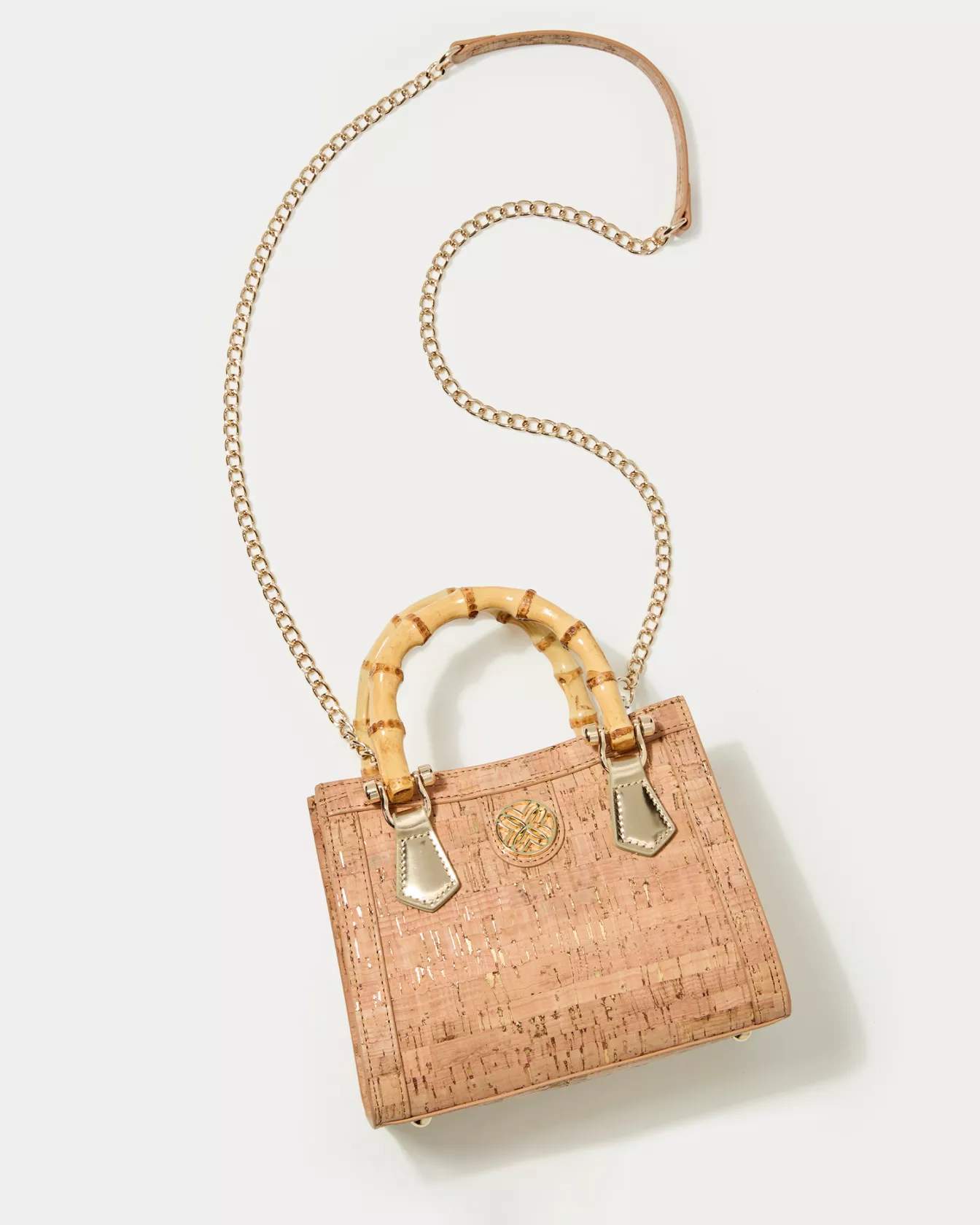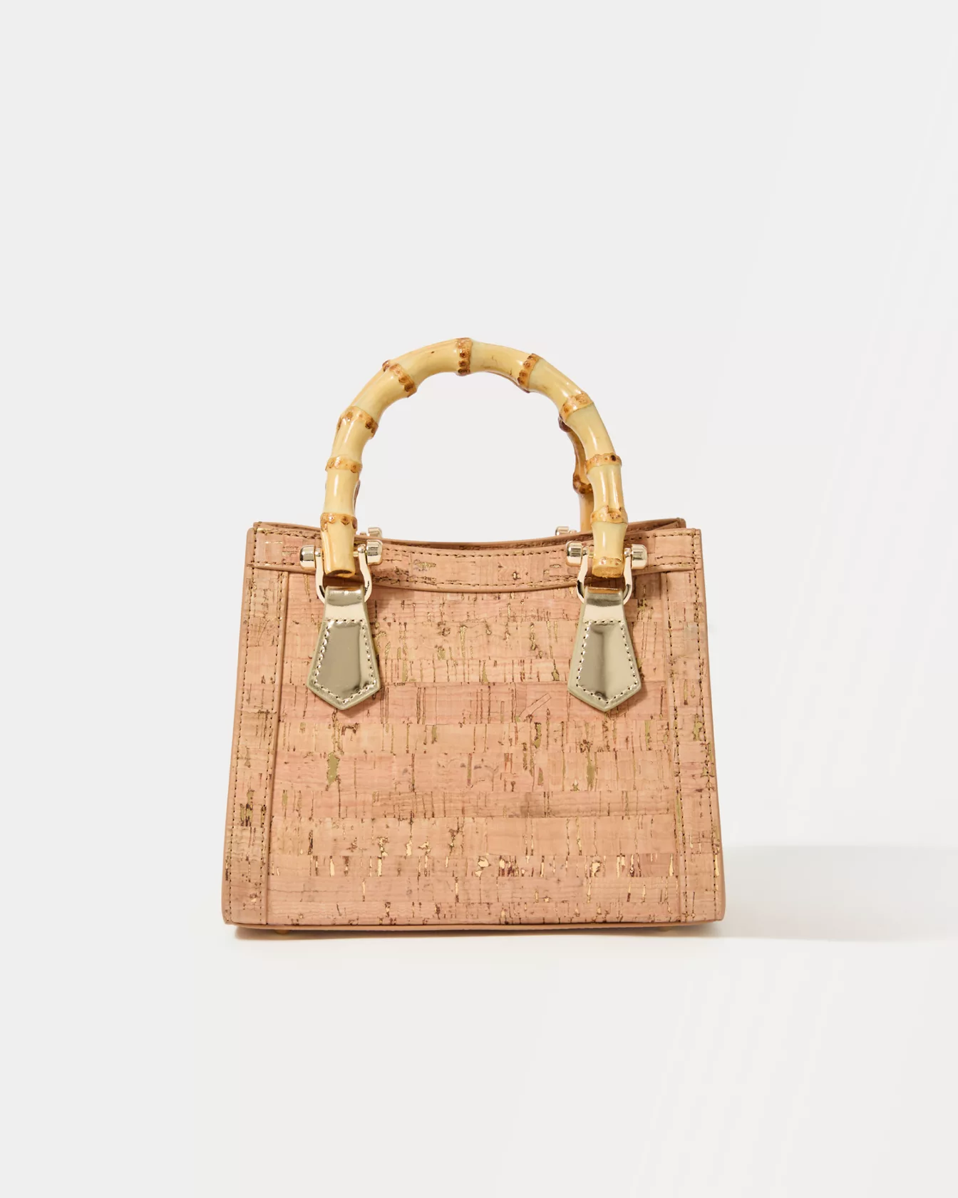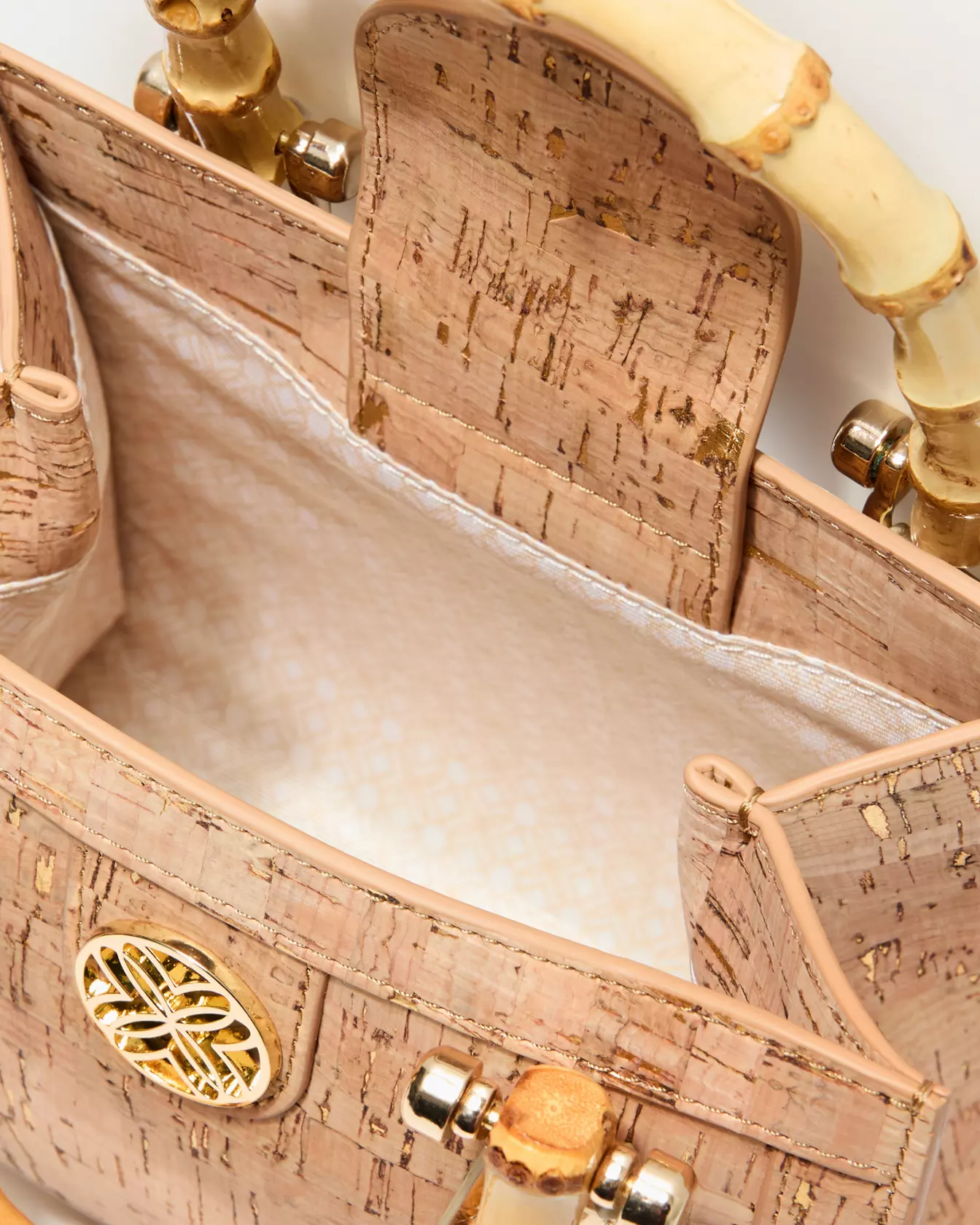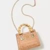 - Metallic cork mini bag with mirrored leather details, natural bamboo top handles, and a detachable gold metal chain crossbody strap.