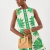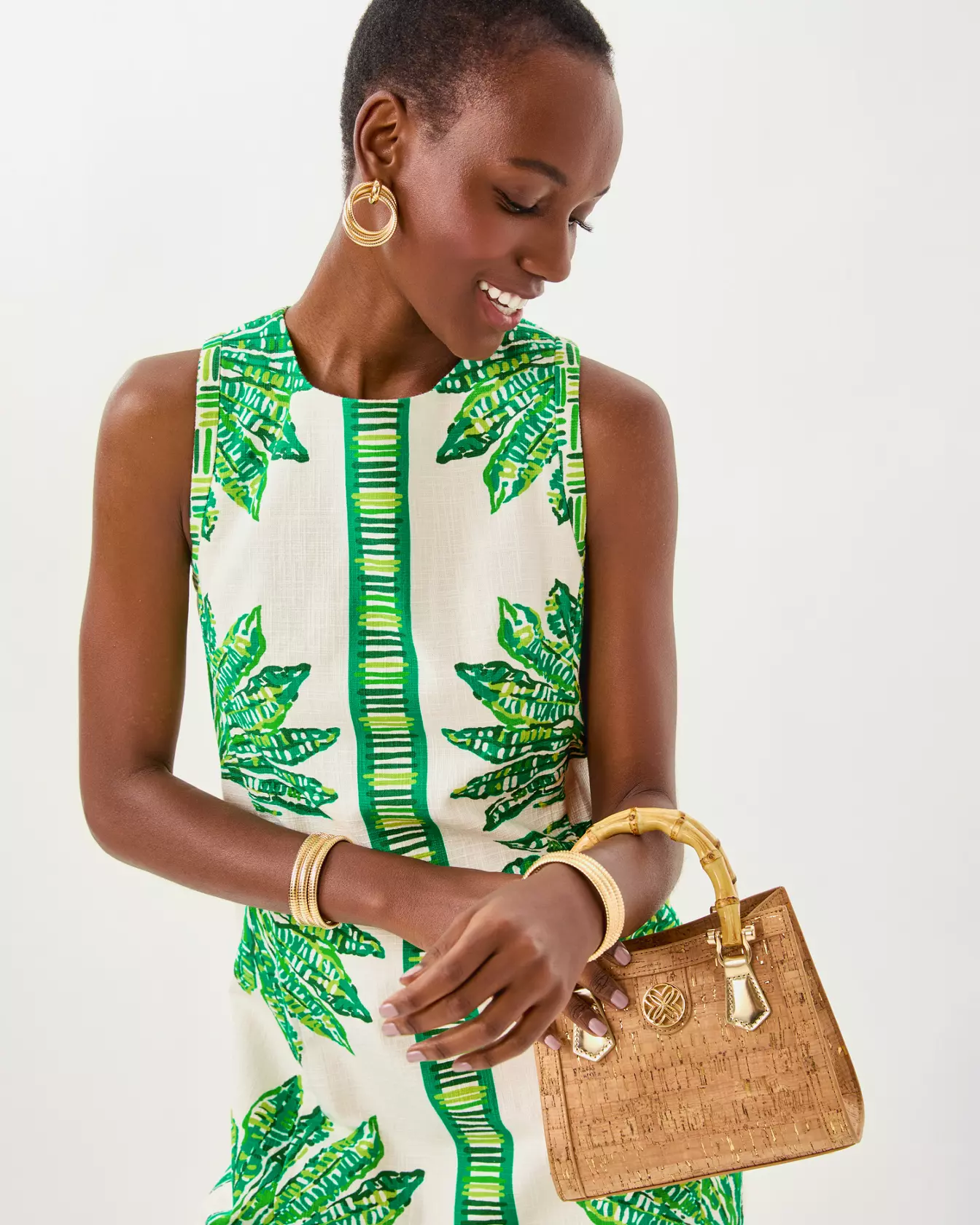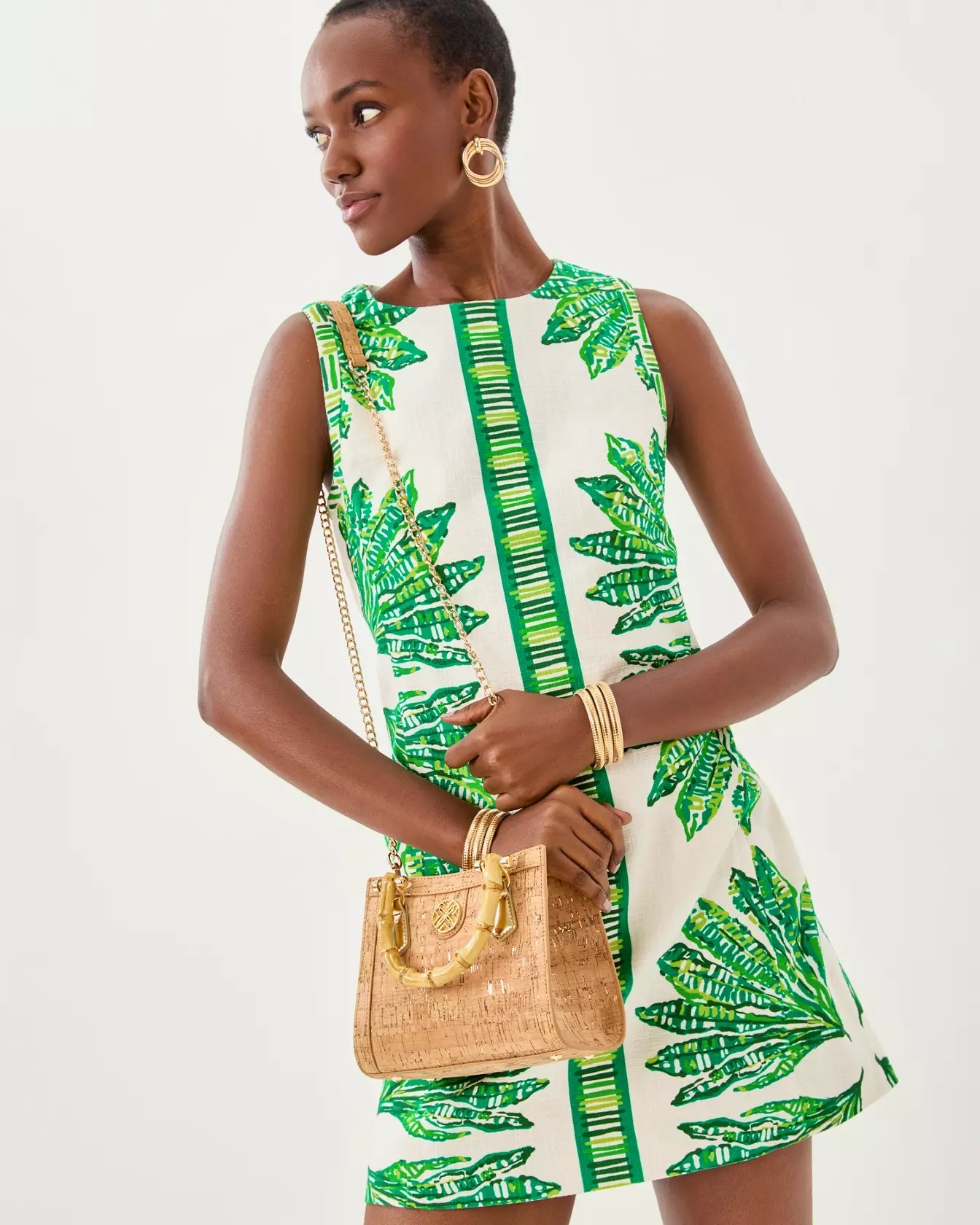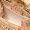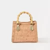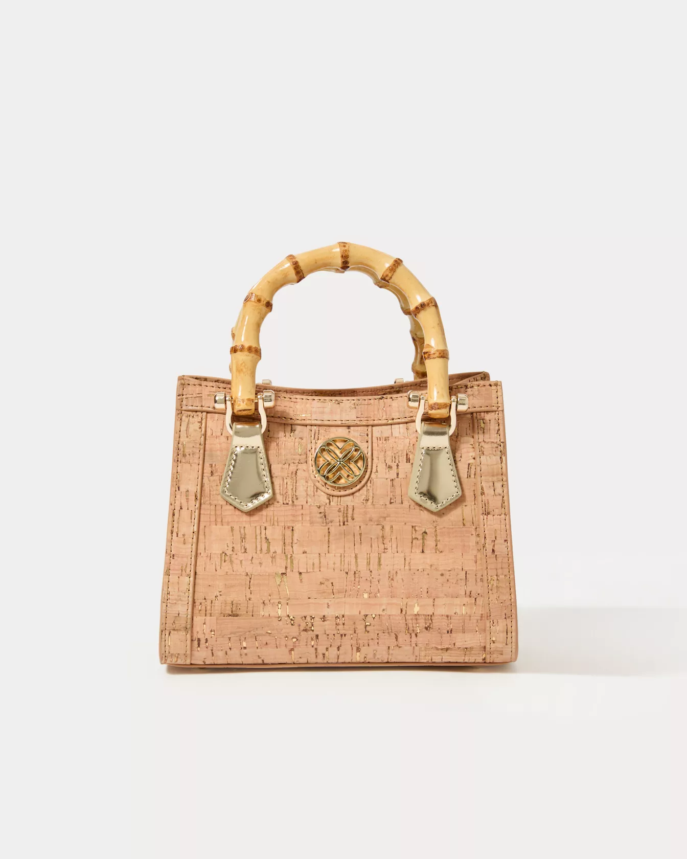 - Metallic cork mini bag with mirrored leather details, natural bamboo top handles, and a detachable gold metal chain crossbody strap.