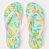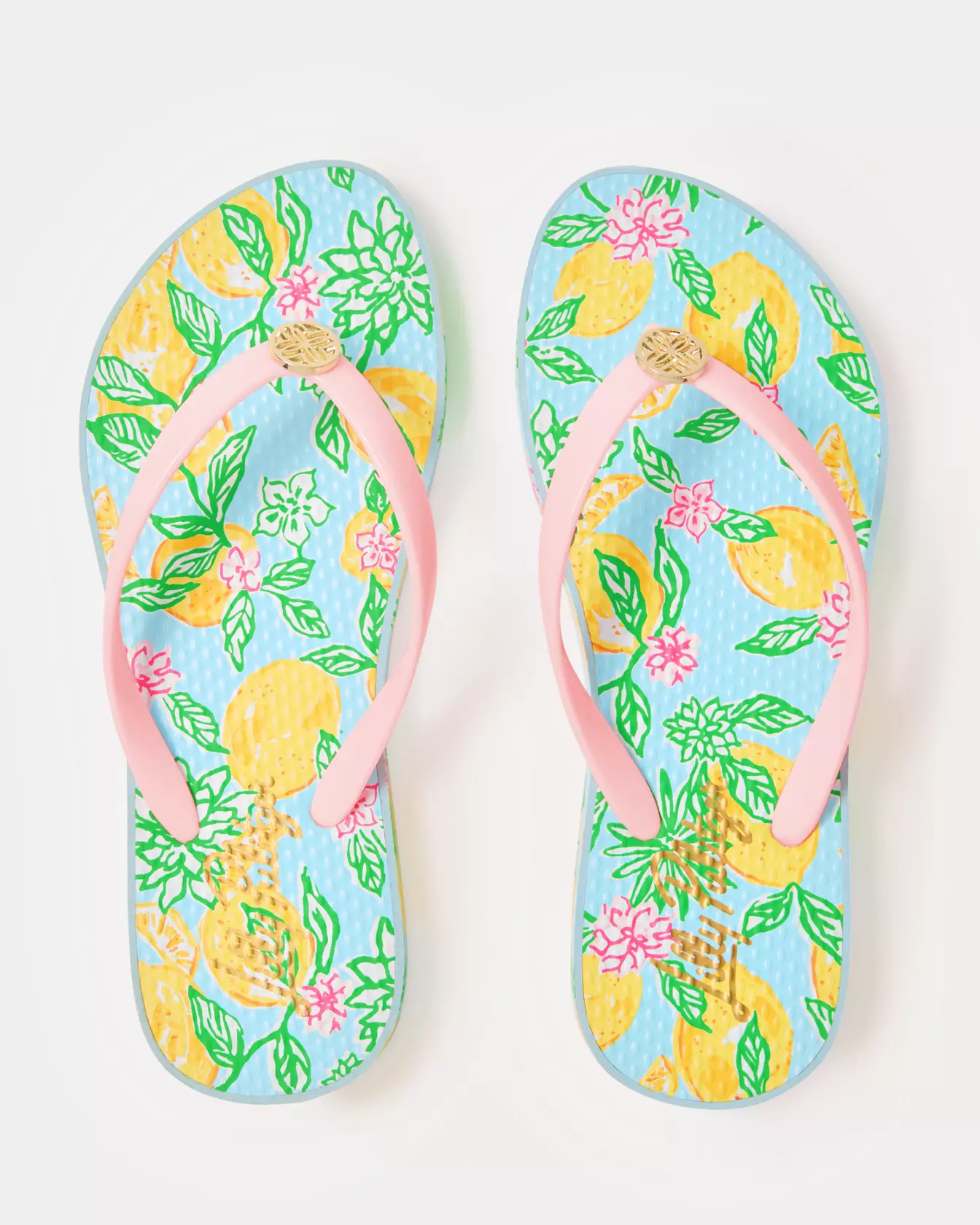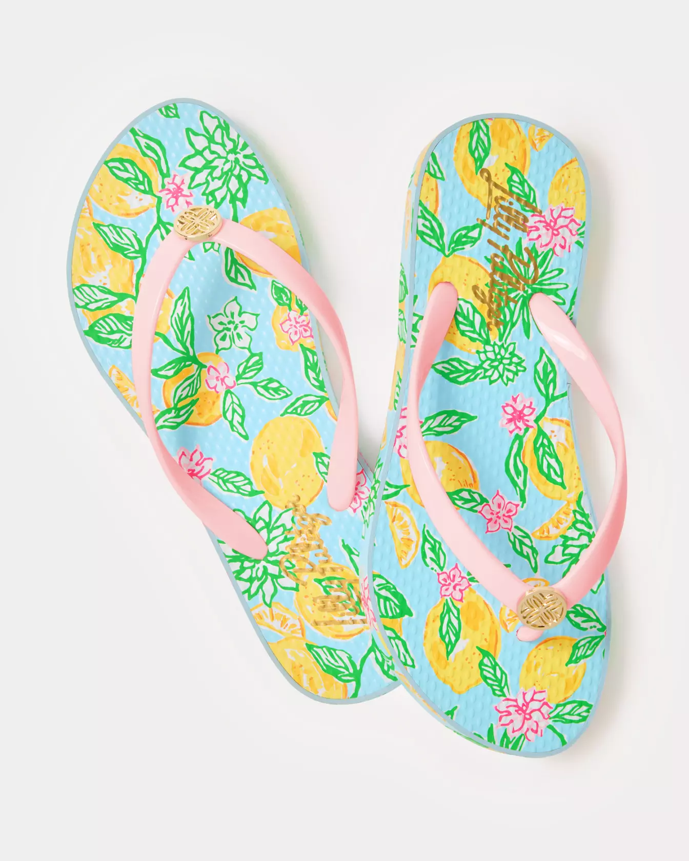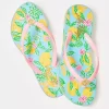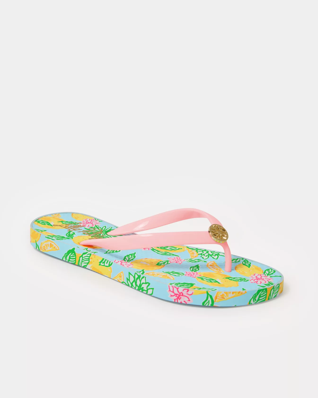 We dressed up the essential poolside flip flop with lots of Lilly details! Avibrant print covers the sole, paired with a solid jelly upper. Match yoursandals to your printed swimwear or coordinate with a solid custom color suit.