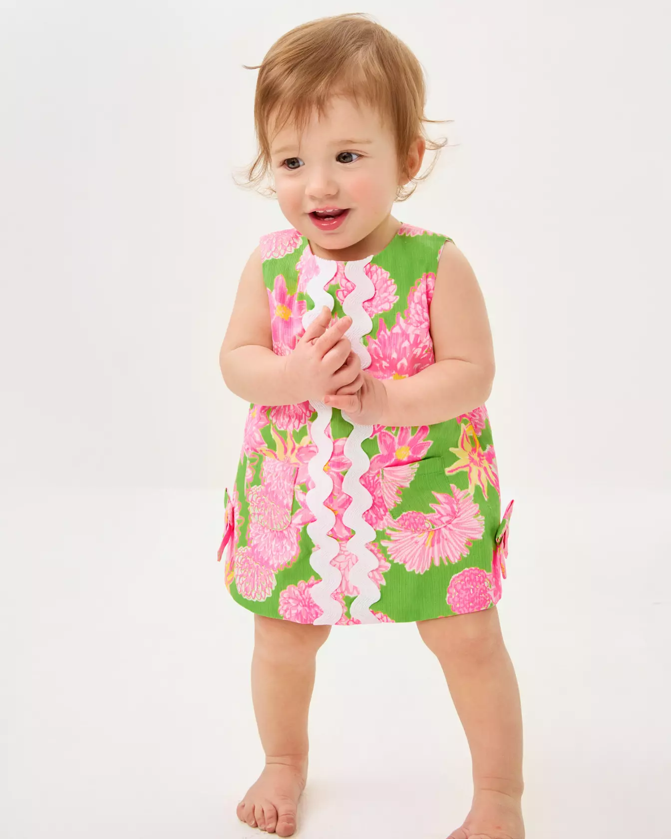 - Classic infant shift dress with trim details, a button back closure, and patch pockets. This style also features lining, hem bows, and matching bloomers.