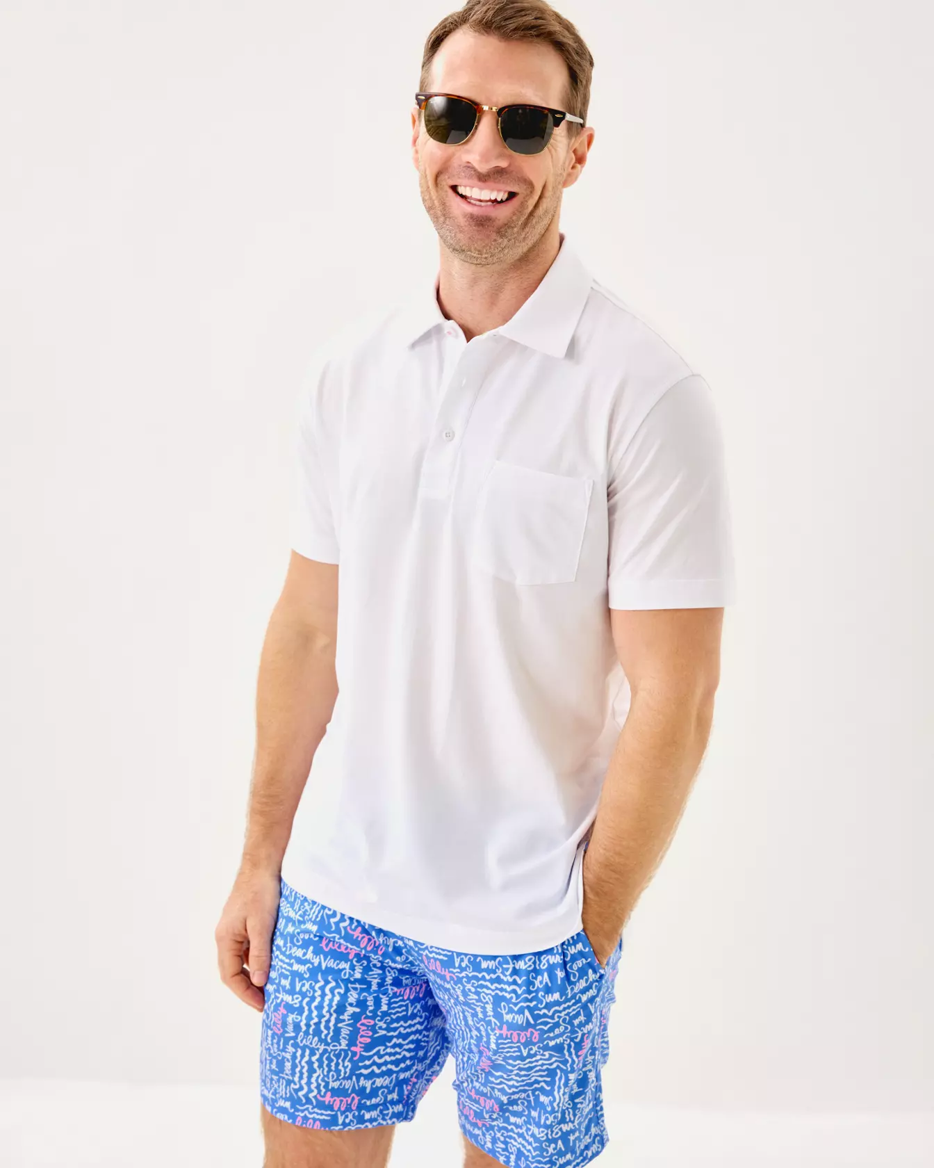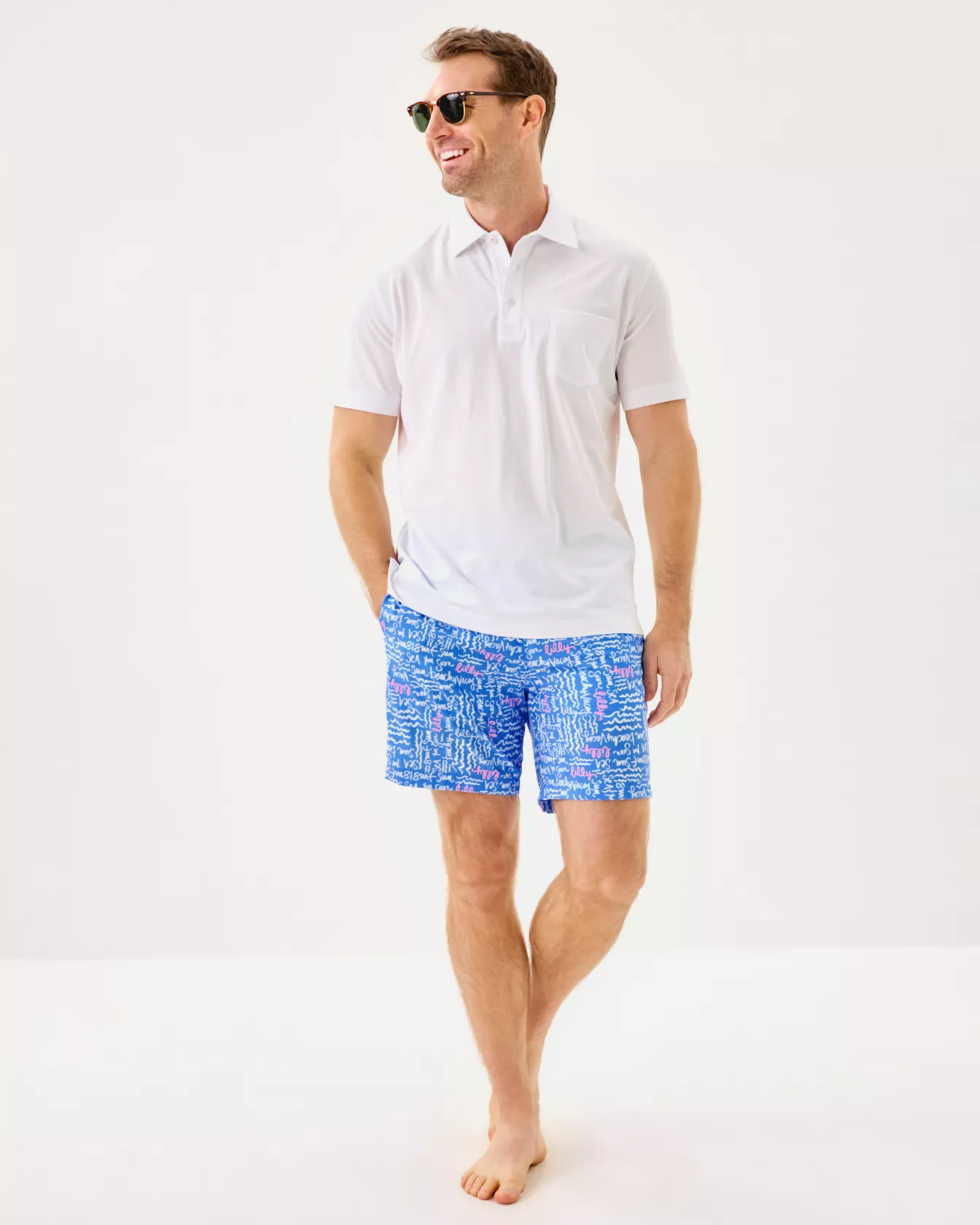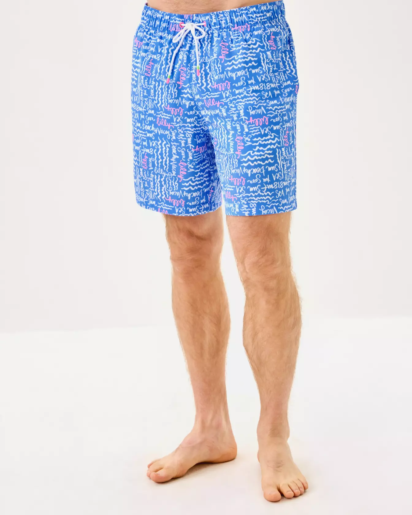 - Boxer-style swim trunk with an elastic & drawstring waist and a mesh boxer liner.