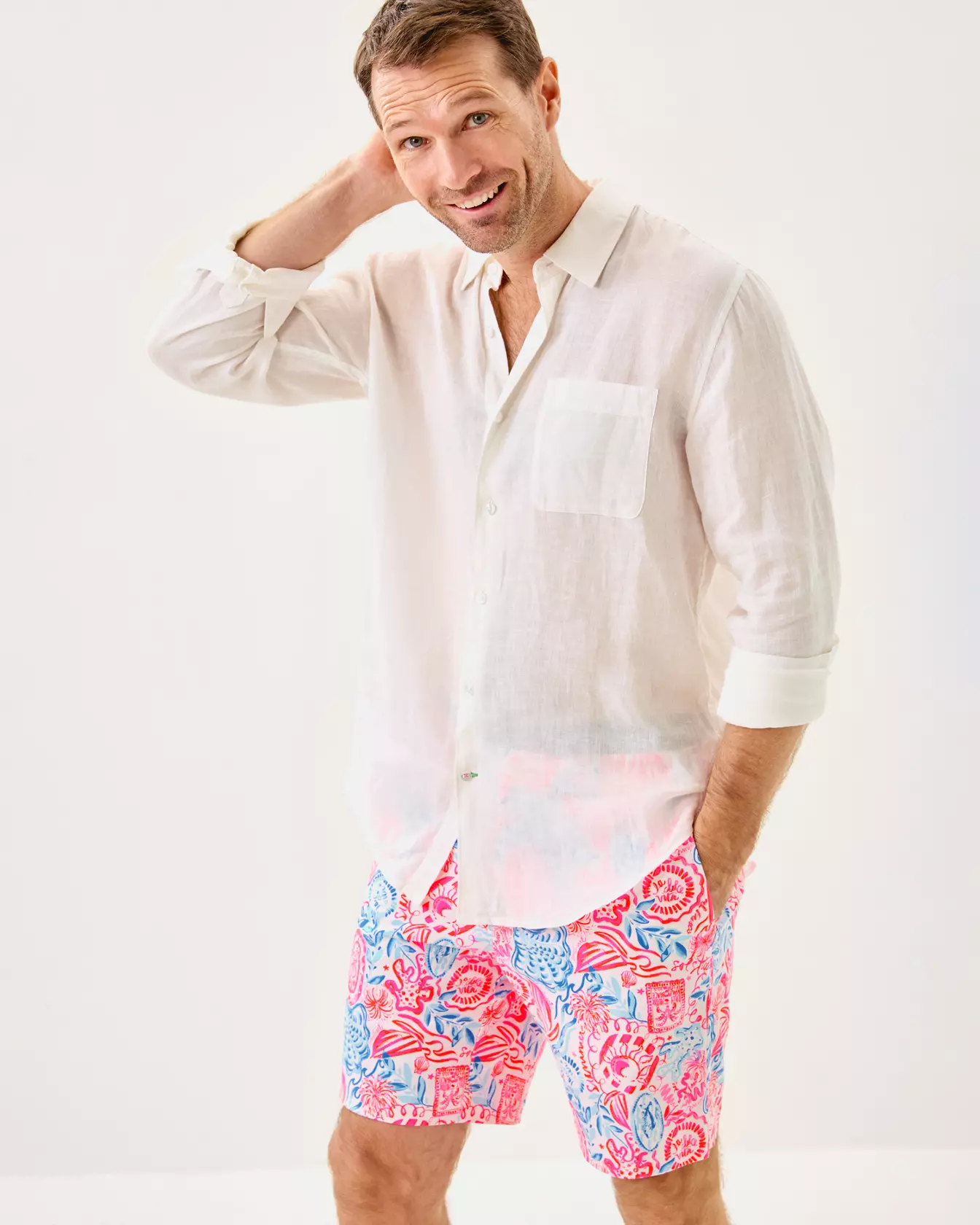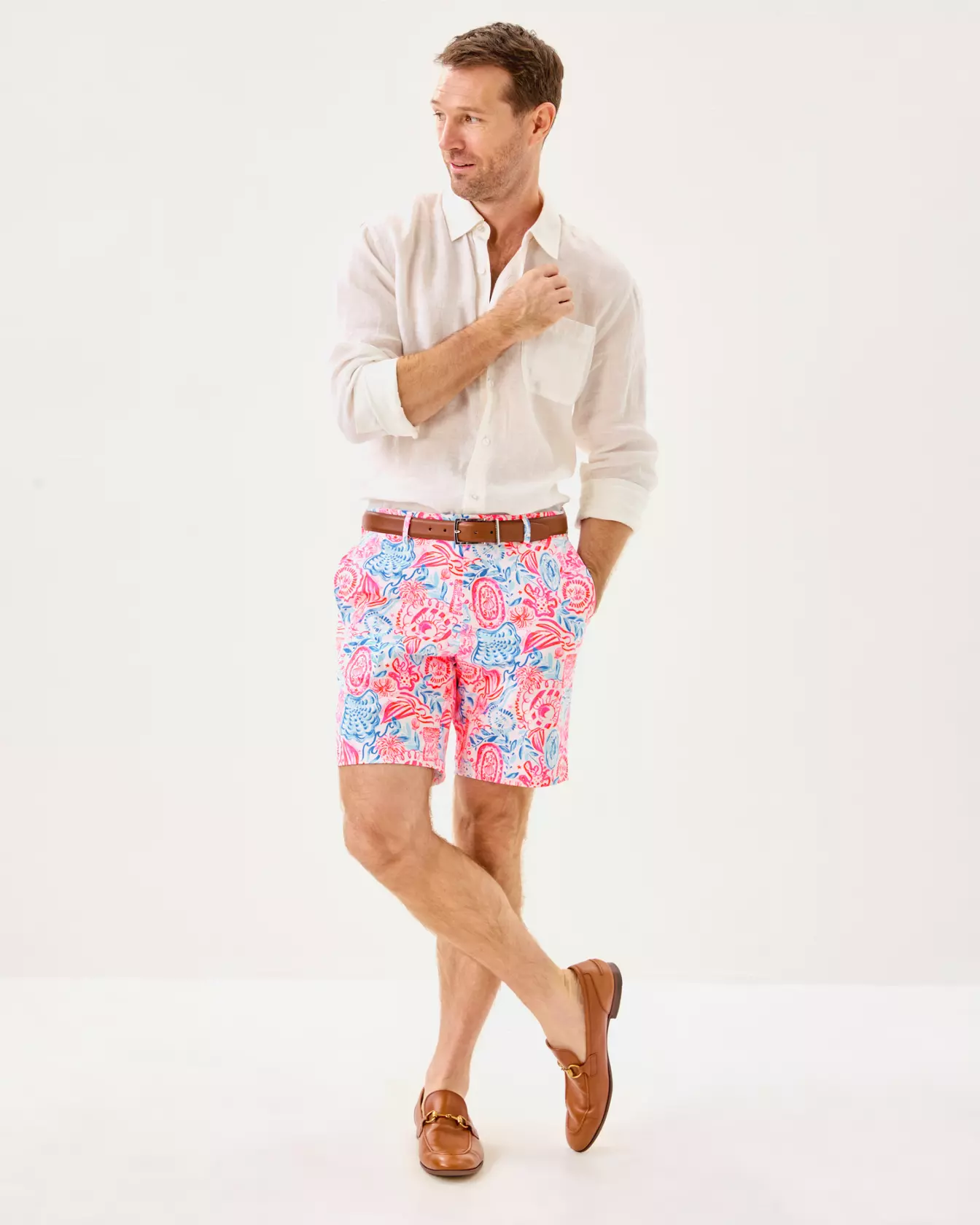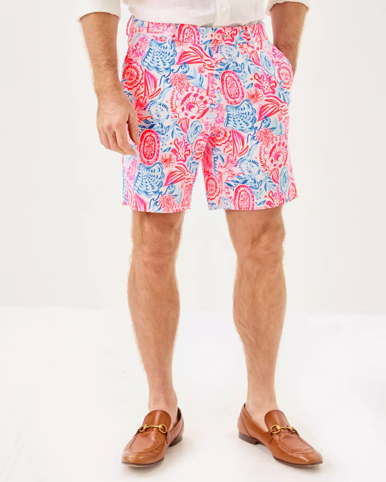 - Stretch, flat front short with pockets and a fully alterable self waistband.