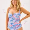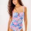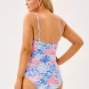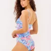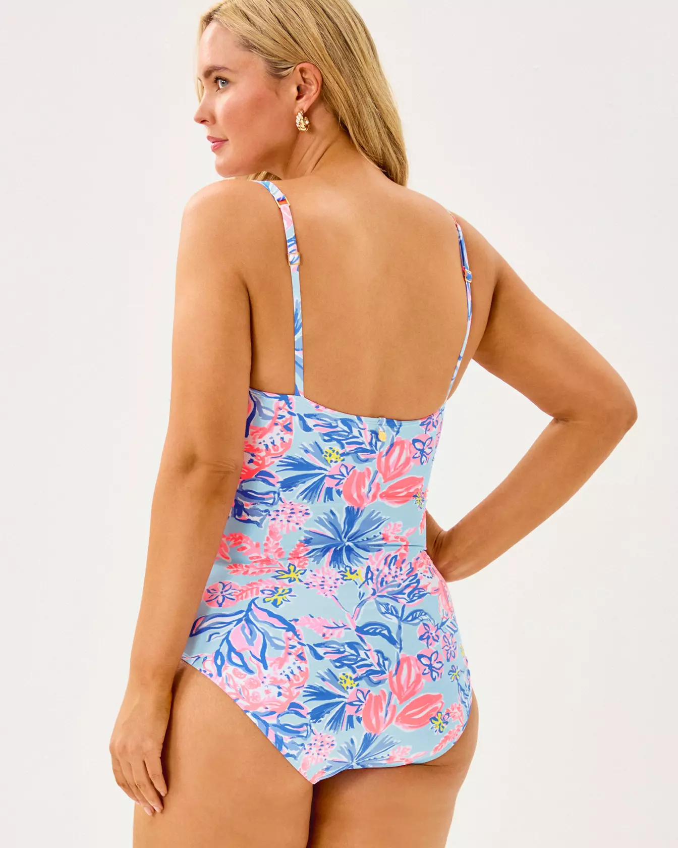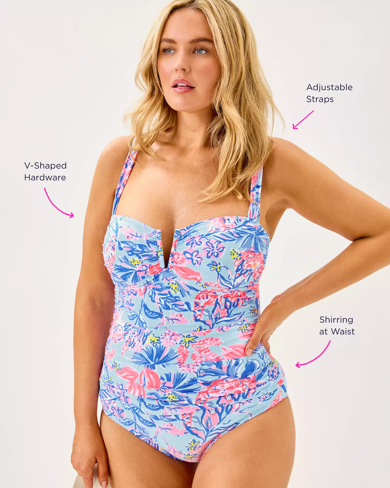 - One-piece swimsuit with v-shaped hardware, shirring, and adjustable straps.