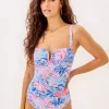- One-piece swimsuit with v-shaped hardware, shirring, and adjustable straps.