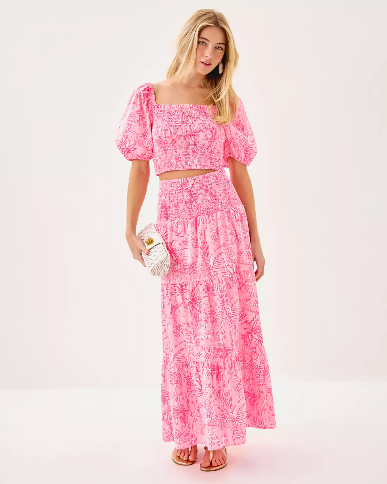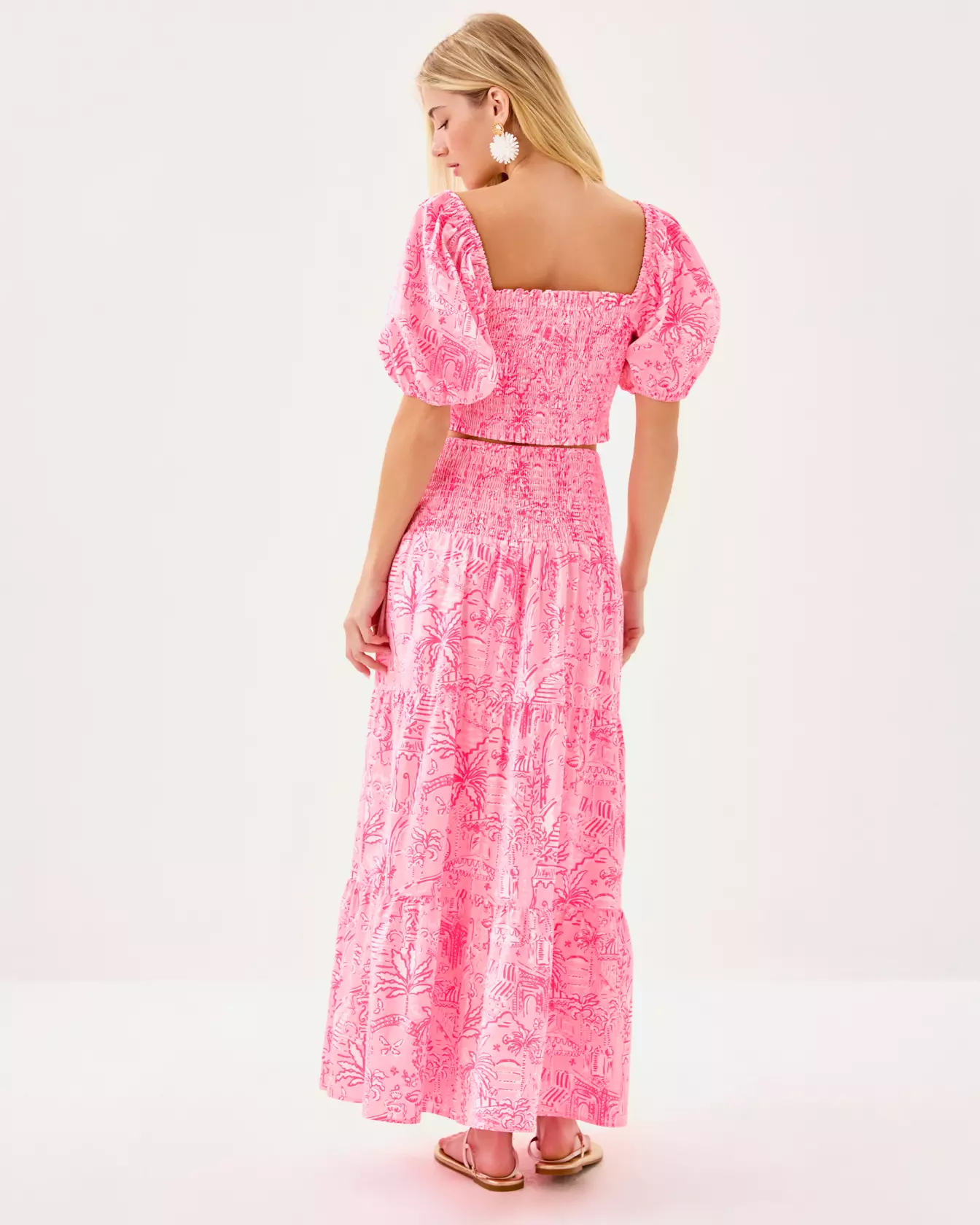 Double up on vibrant print with our Aston Maxi Set. Fashioned from lightweight cotton poplin, this two-piece set includes a smocked puff sleeve top and tiered skirt.