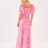 - Puff sleeve top with a smocked bodice and a tiered maxi skirt with an elastic waistband.