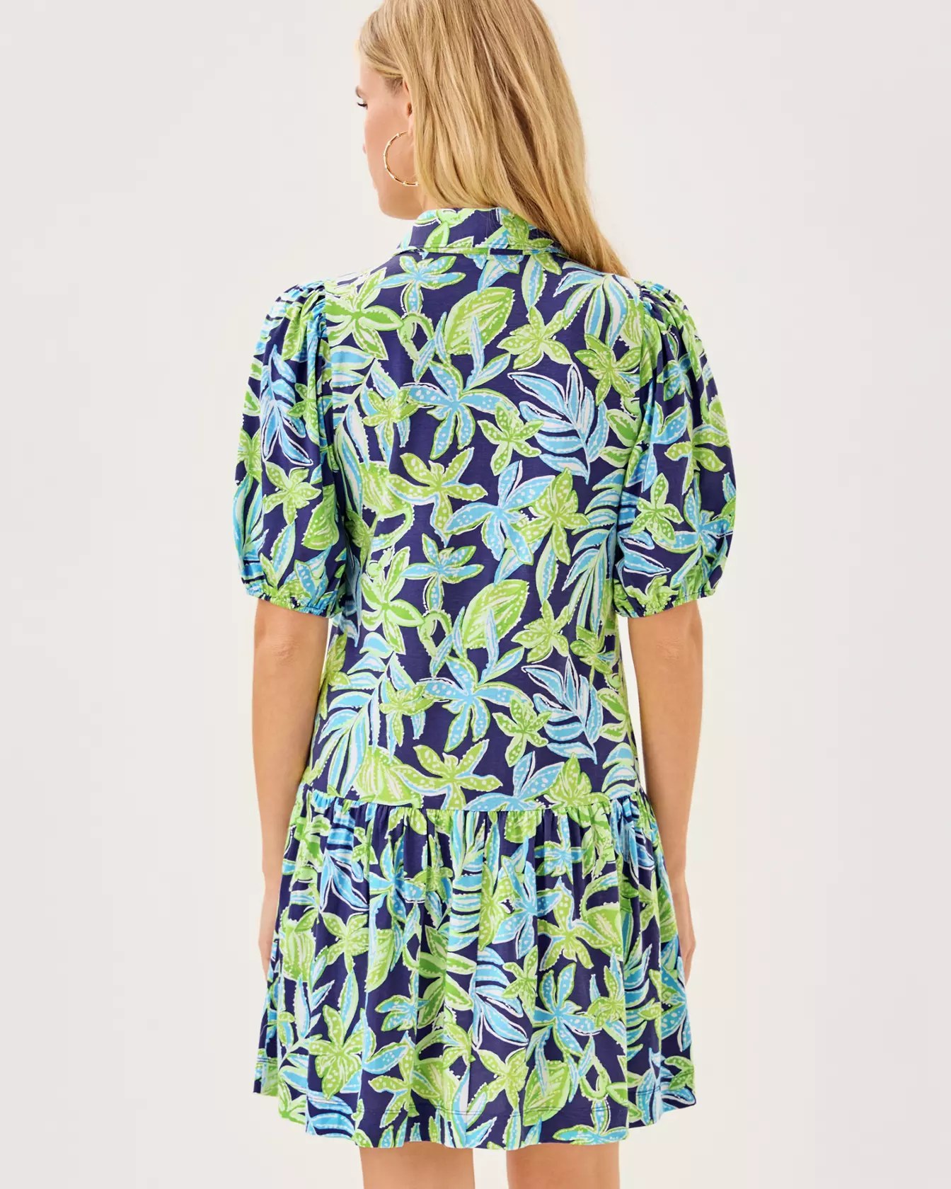 - Easy fit, popover shirtdress with a collar, gold buttons, elbow-length sleeves, and a tall ruffle at the hem.