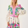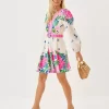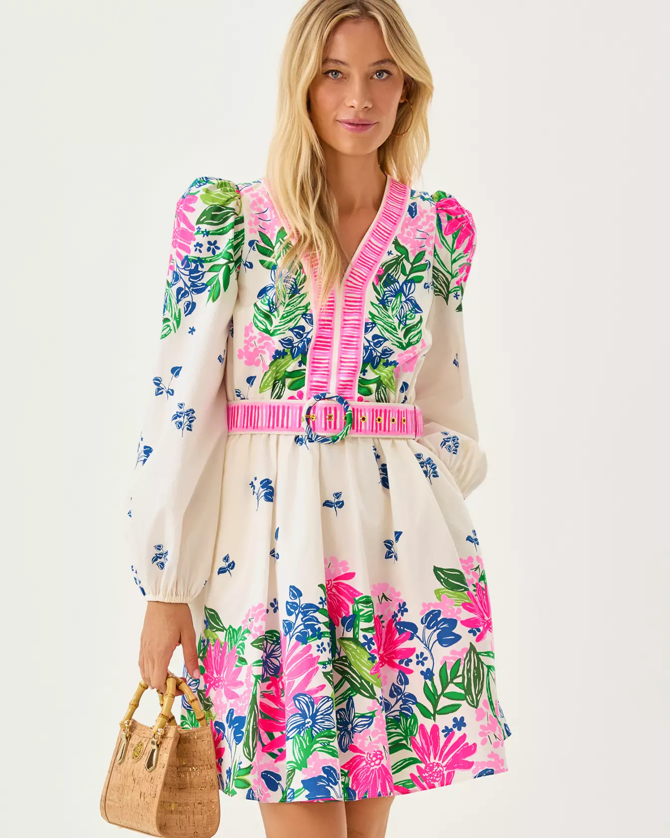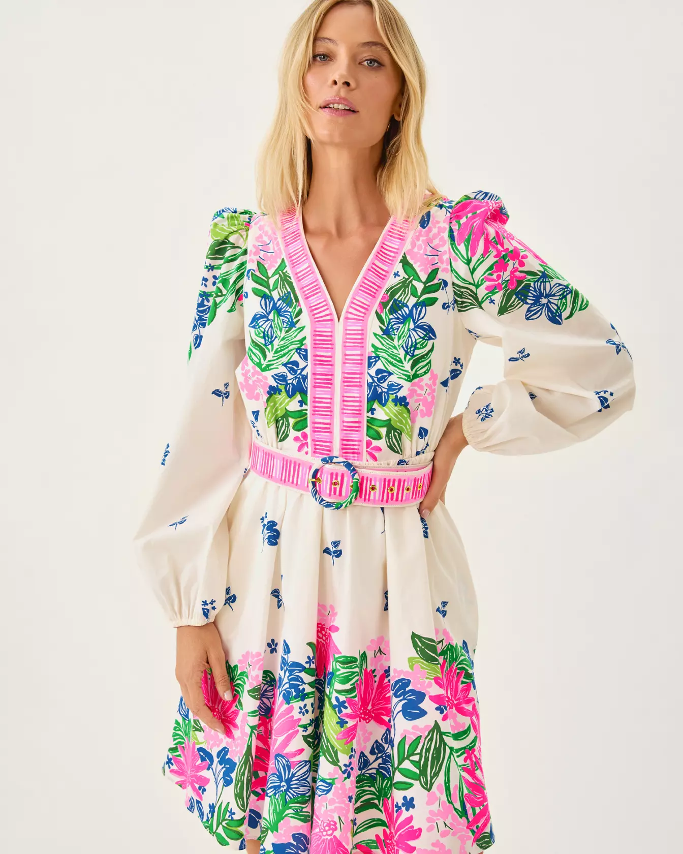 - Fit-and-flare, v-neck dress with long sleeves, a full skirt, separate belt, and side seam pockets.
