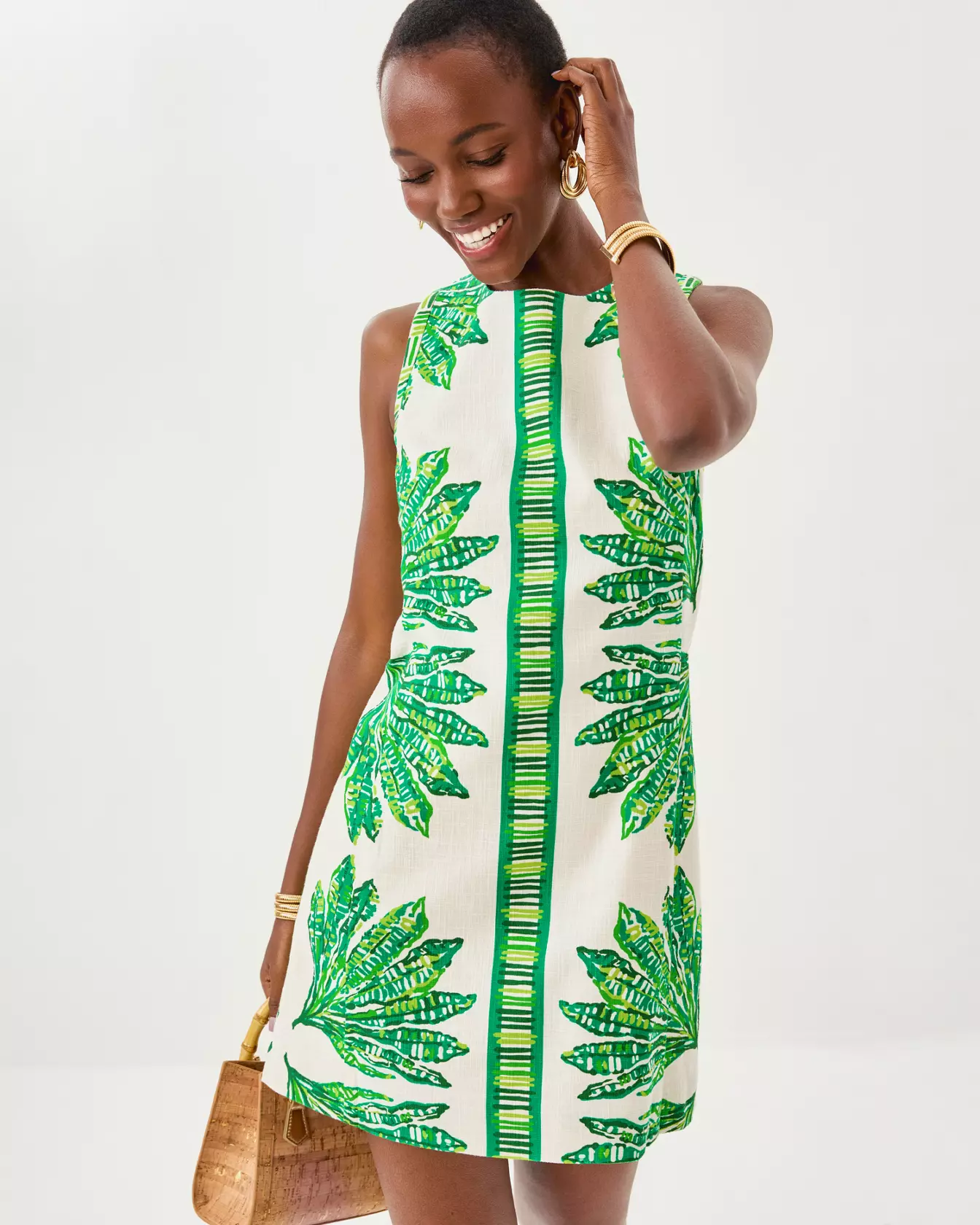 - Straight fit shift dress with a crew neckline, square armholes, and side panels.