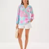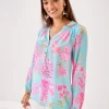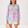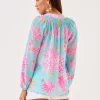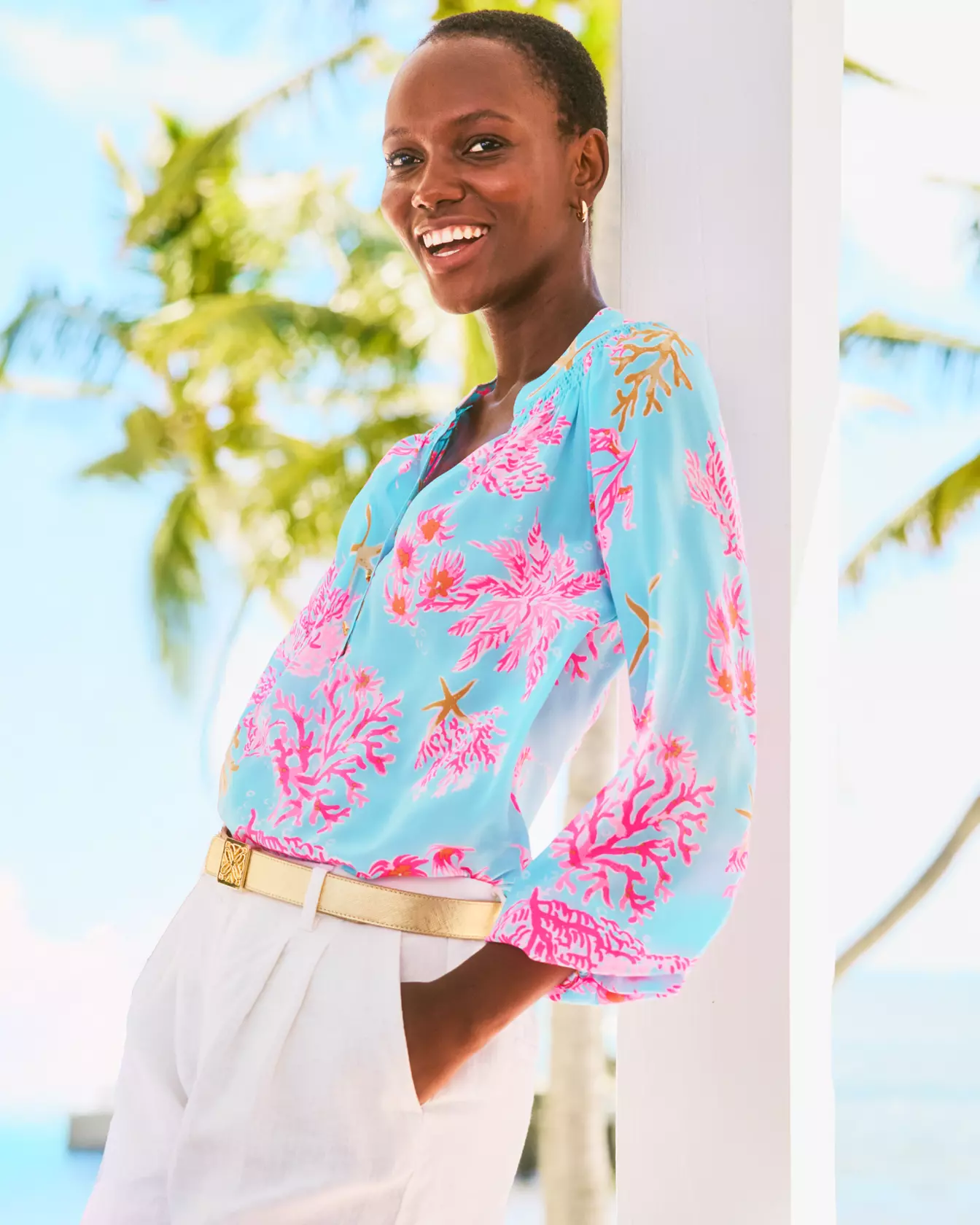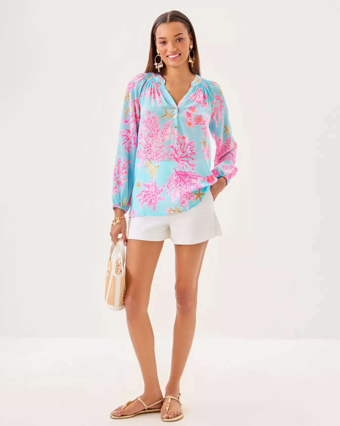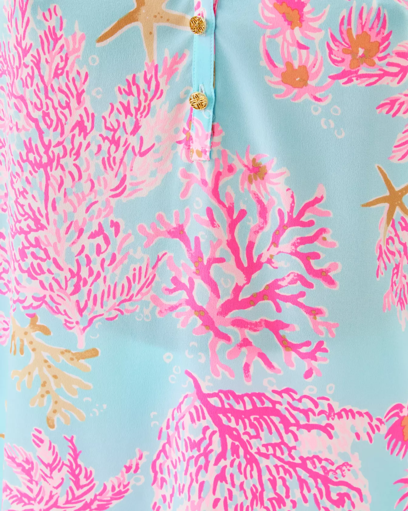 - Easy fit, pullover blouse with gold buttons and bracelet-length sleeves.