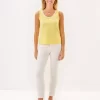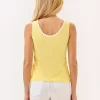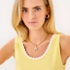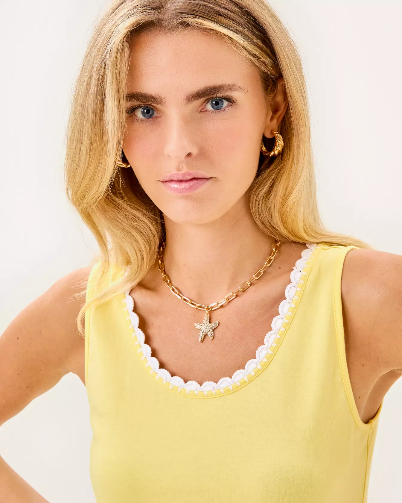 - Straight fit tank with scalloped crochet trim details and a scooped front and back neckline.