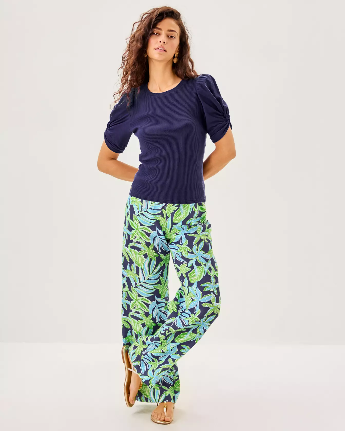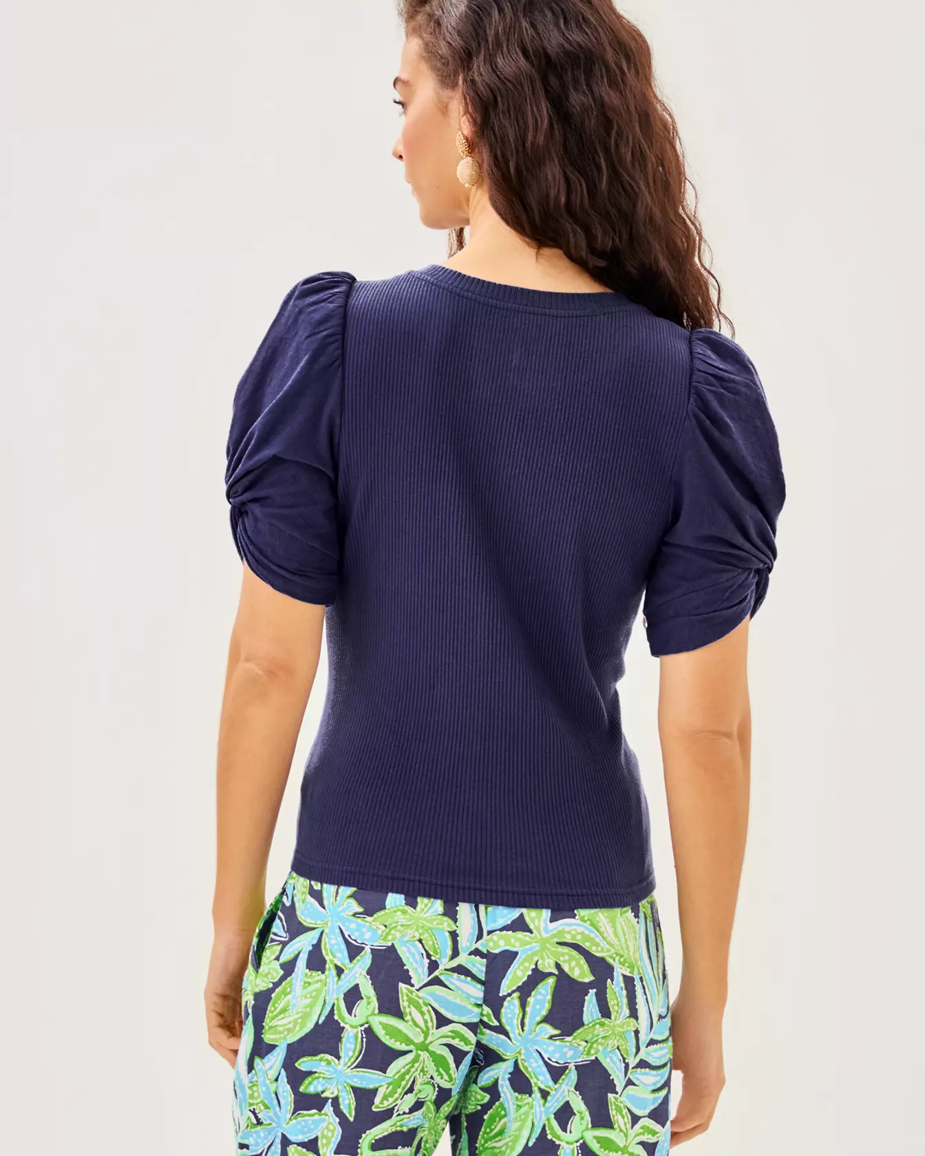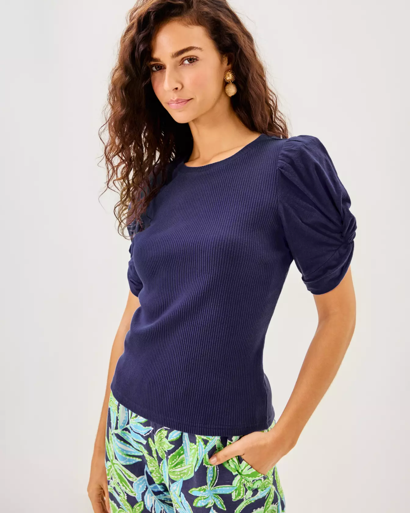 - Fits against body at chest, waist and hip with close-to-body line fit.