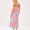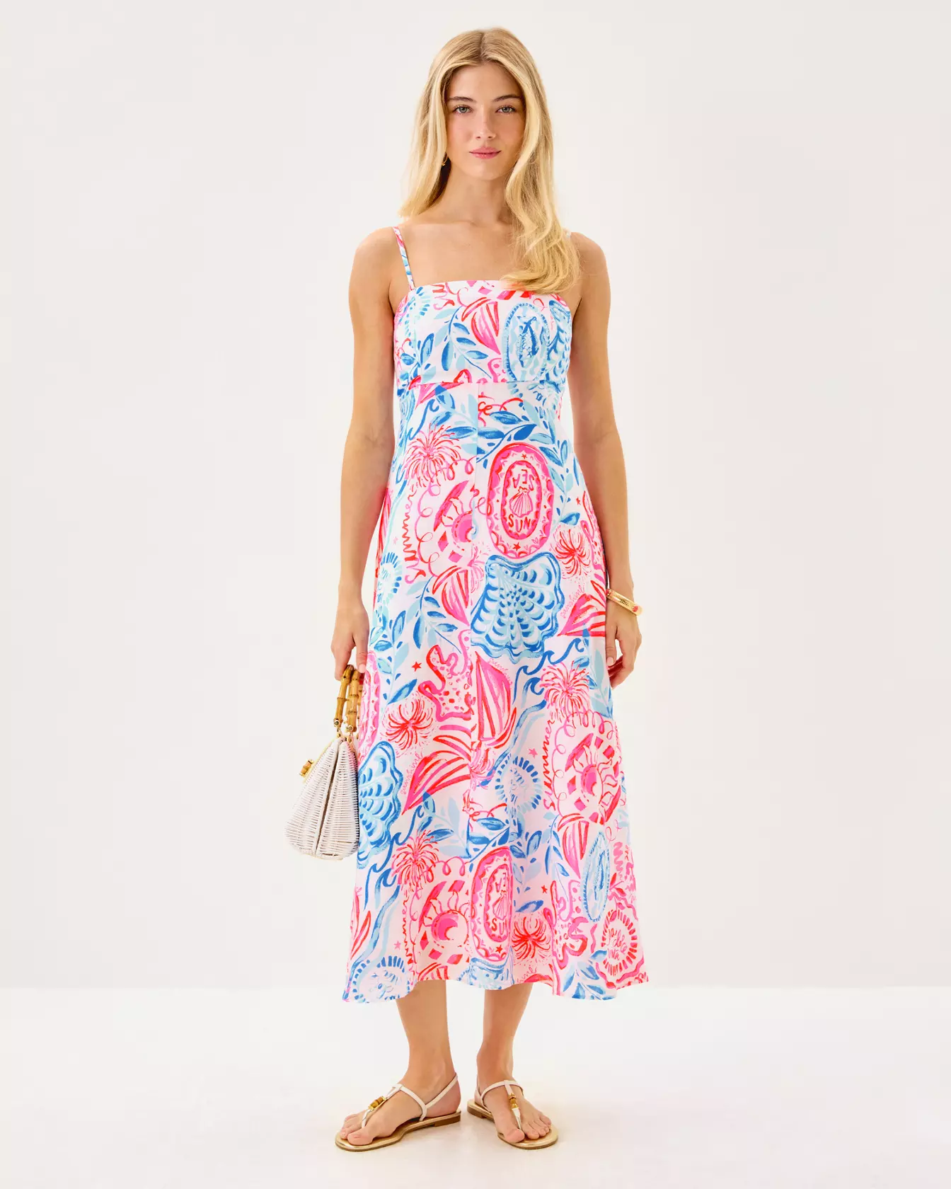 - Fit-and-flare midi dress with detachable spaghetti straps, empire bodice with cups, and a smocked back panel.