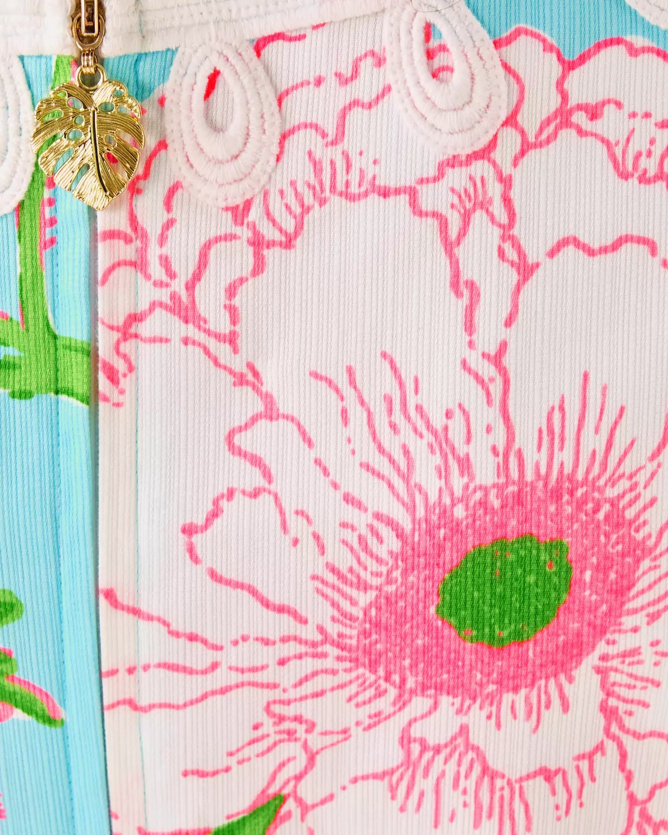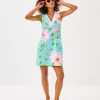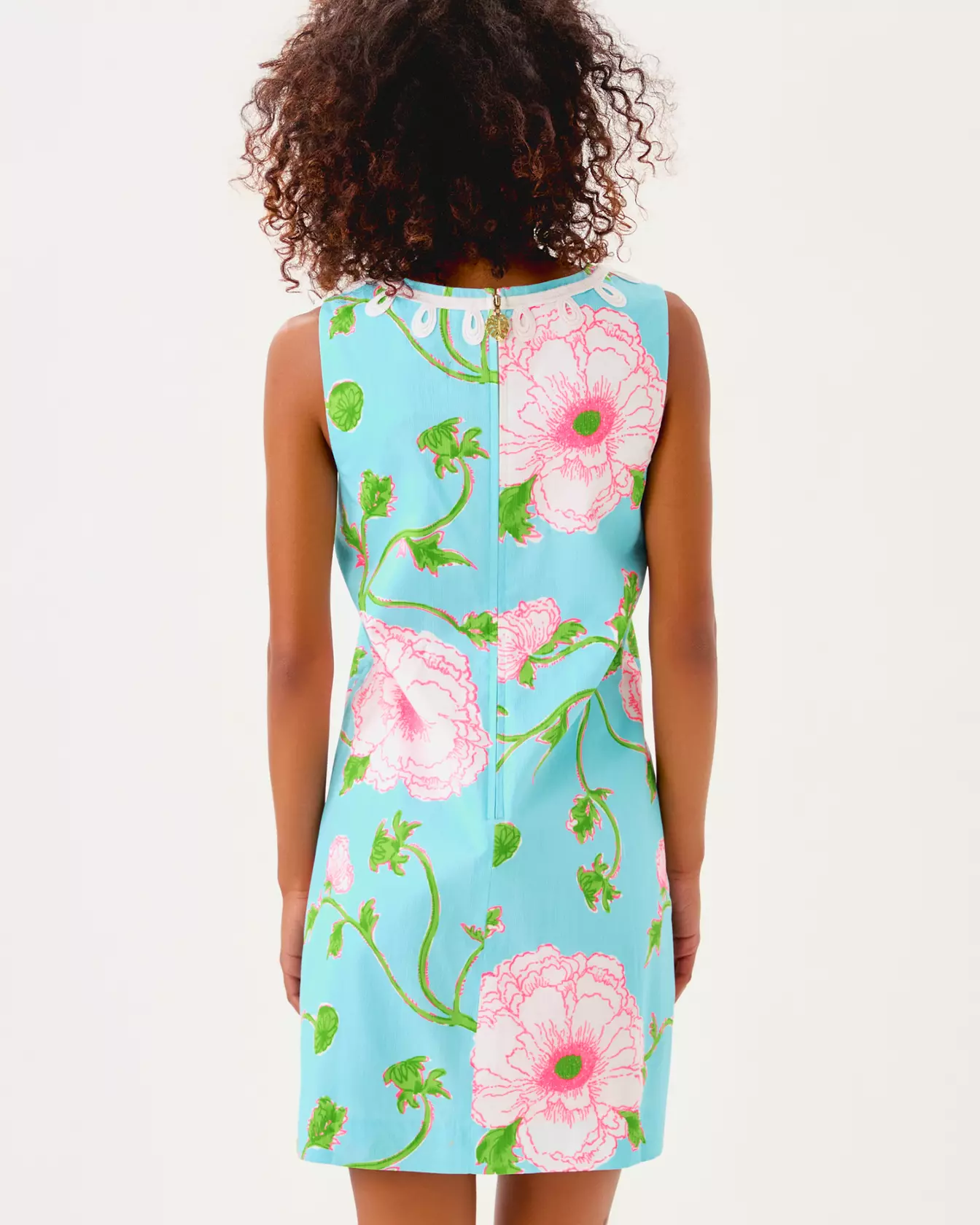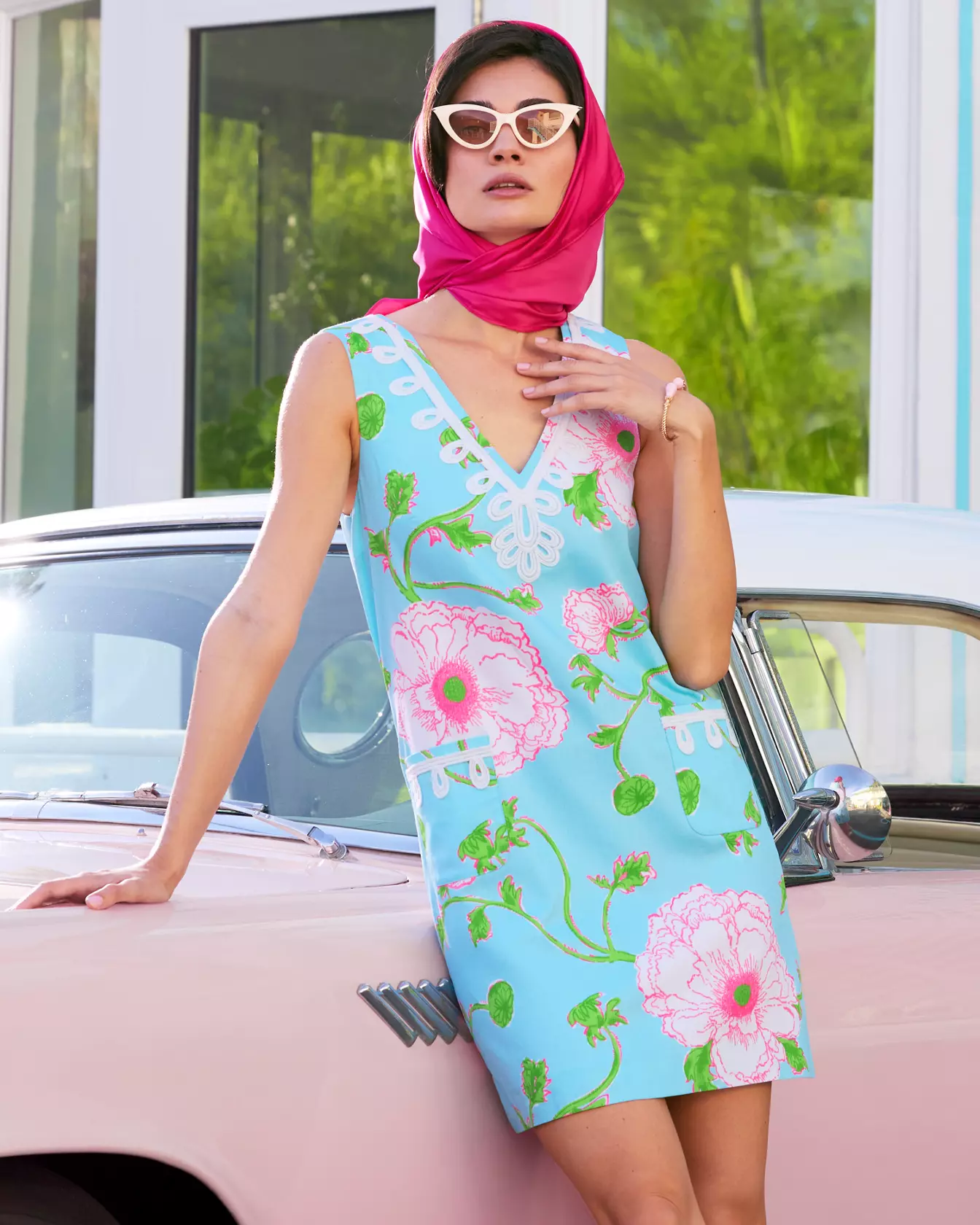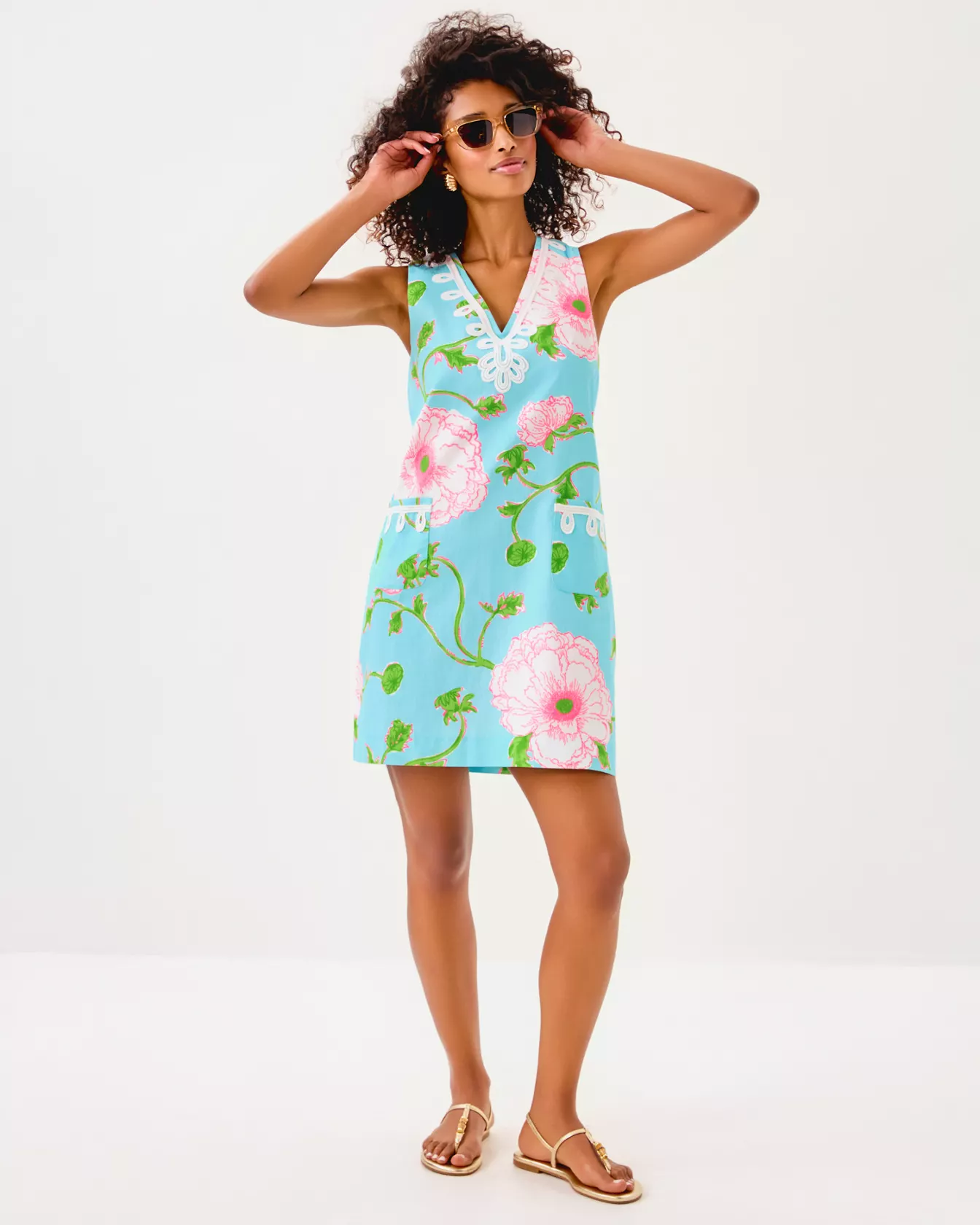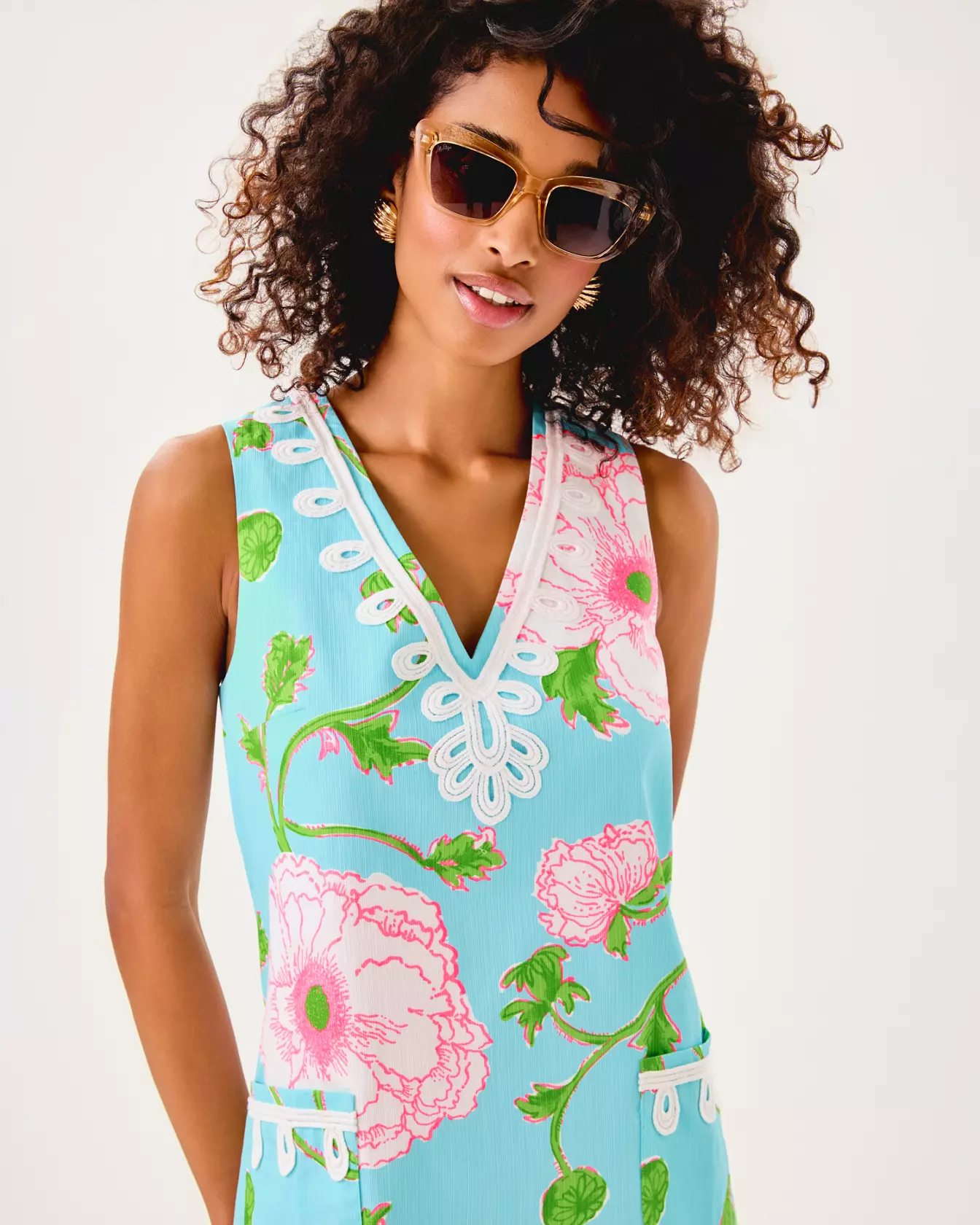 - Straight fit, v-neck shift dress with patch pockets and Lilly lace trim.