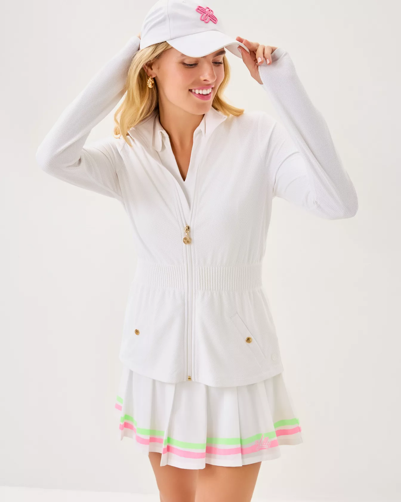 - UPF 50+ Luxletic® full zip jacket with thumb holes, a smocked waist, and pockets. Moisture wicking.