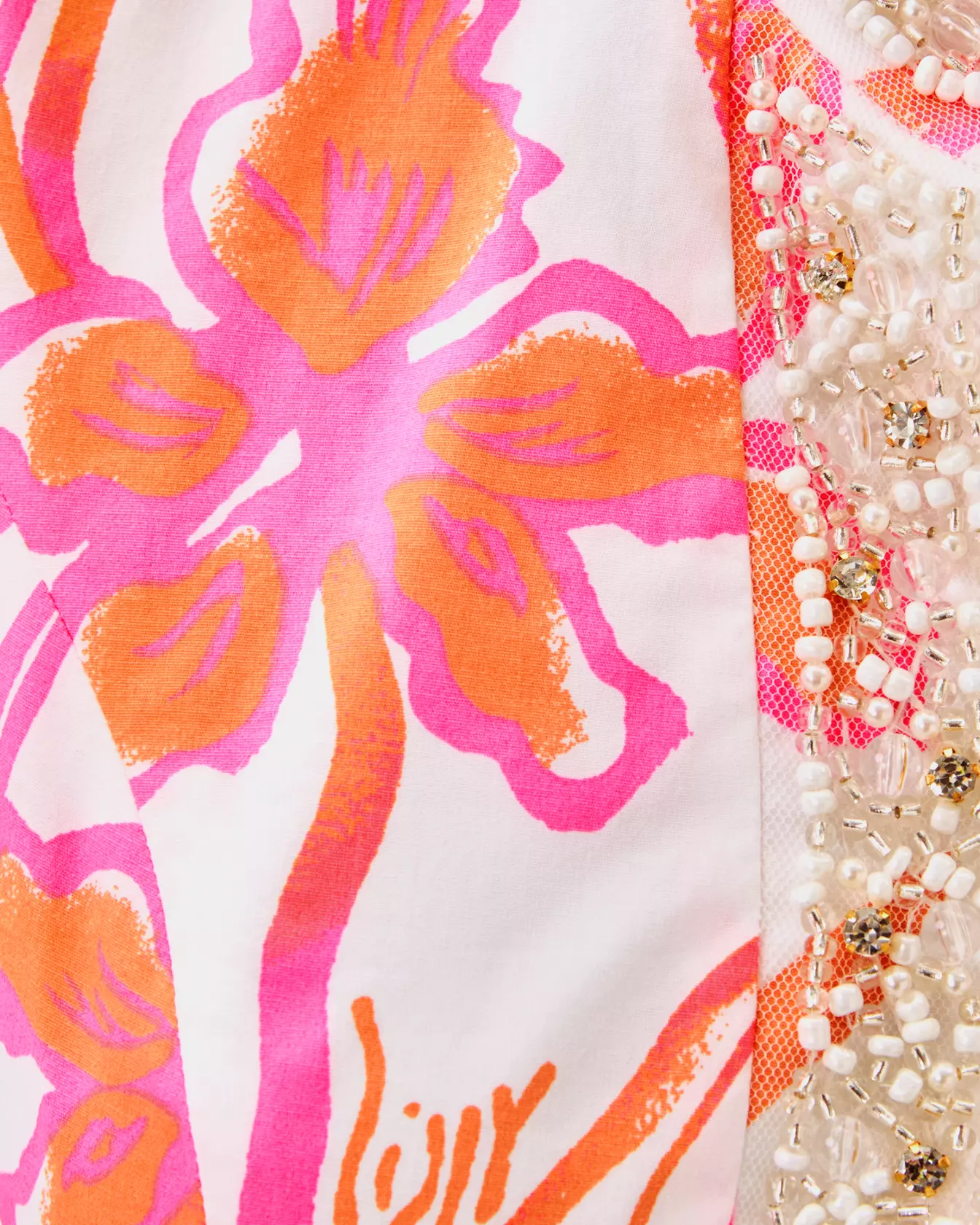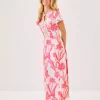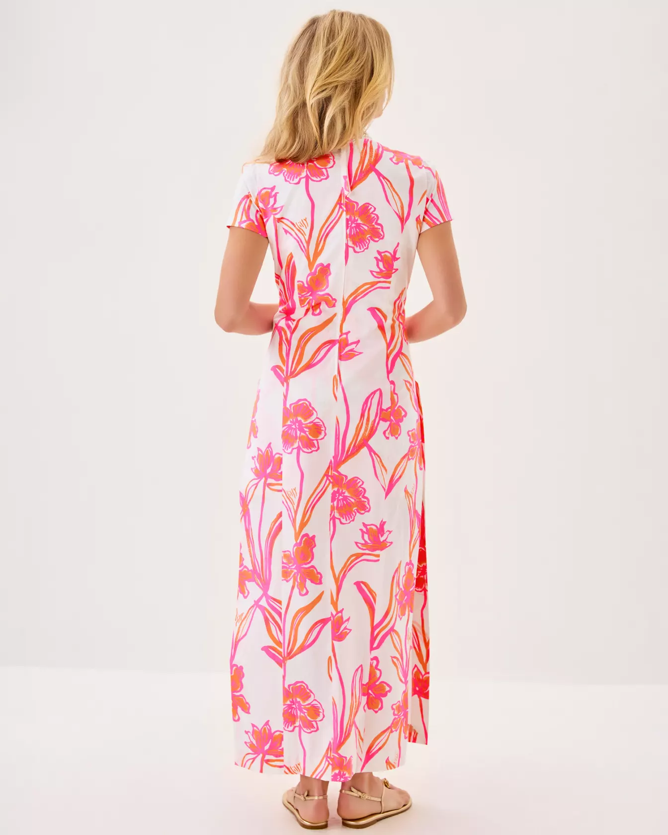 - Maxi romper with side slits, a beaded collar and neckline, and short sleeves.